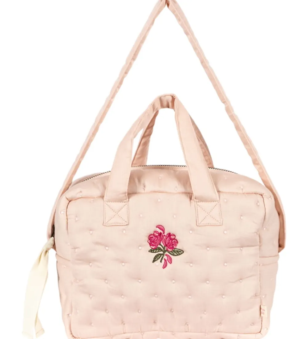 Fin Konges Sløjd dukke pusletaske i en lys rosa med et smukt blomsterbroderi foran.