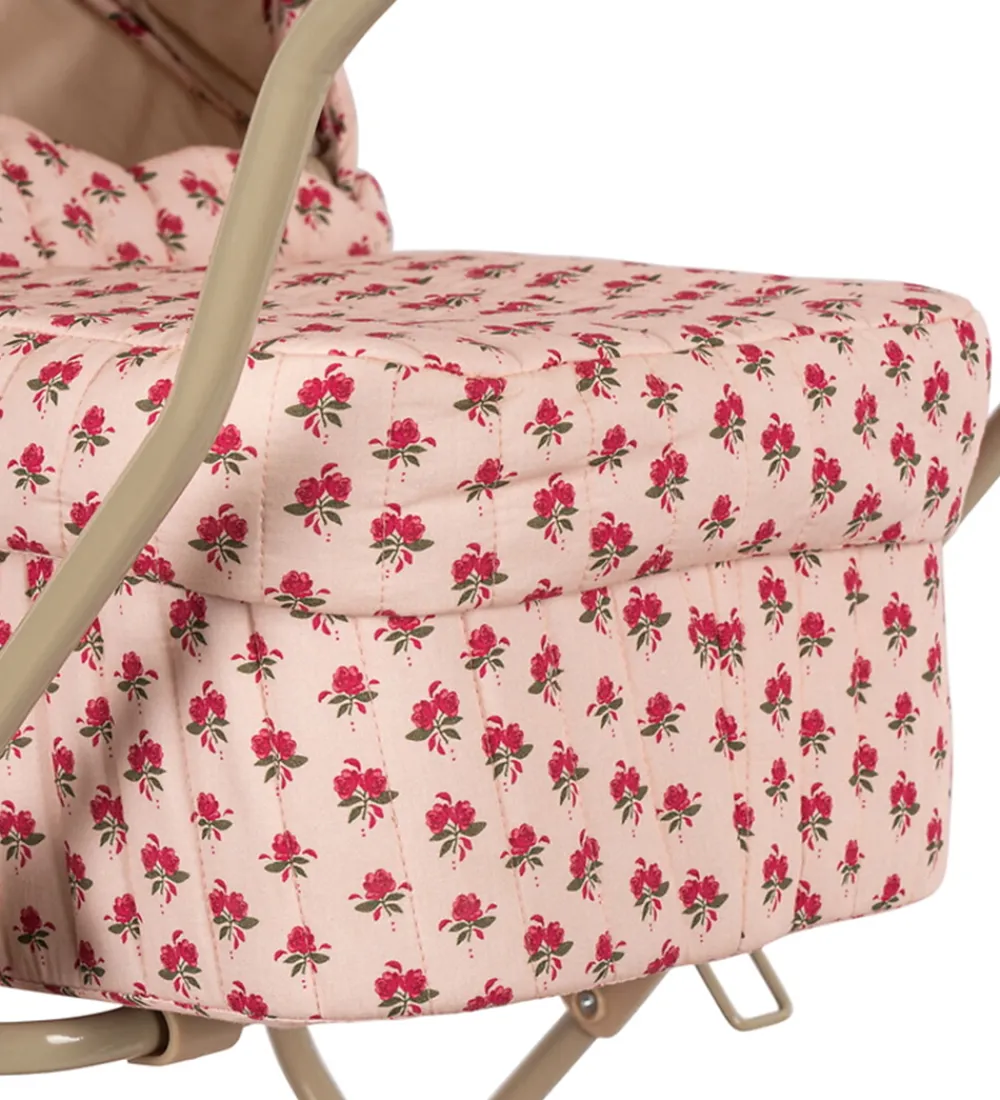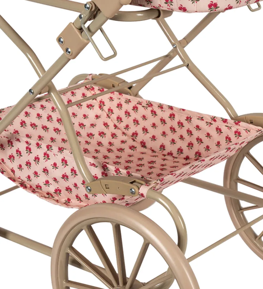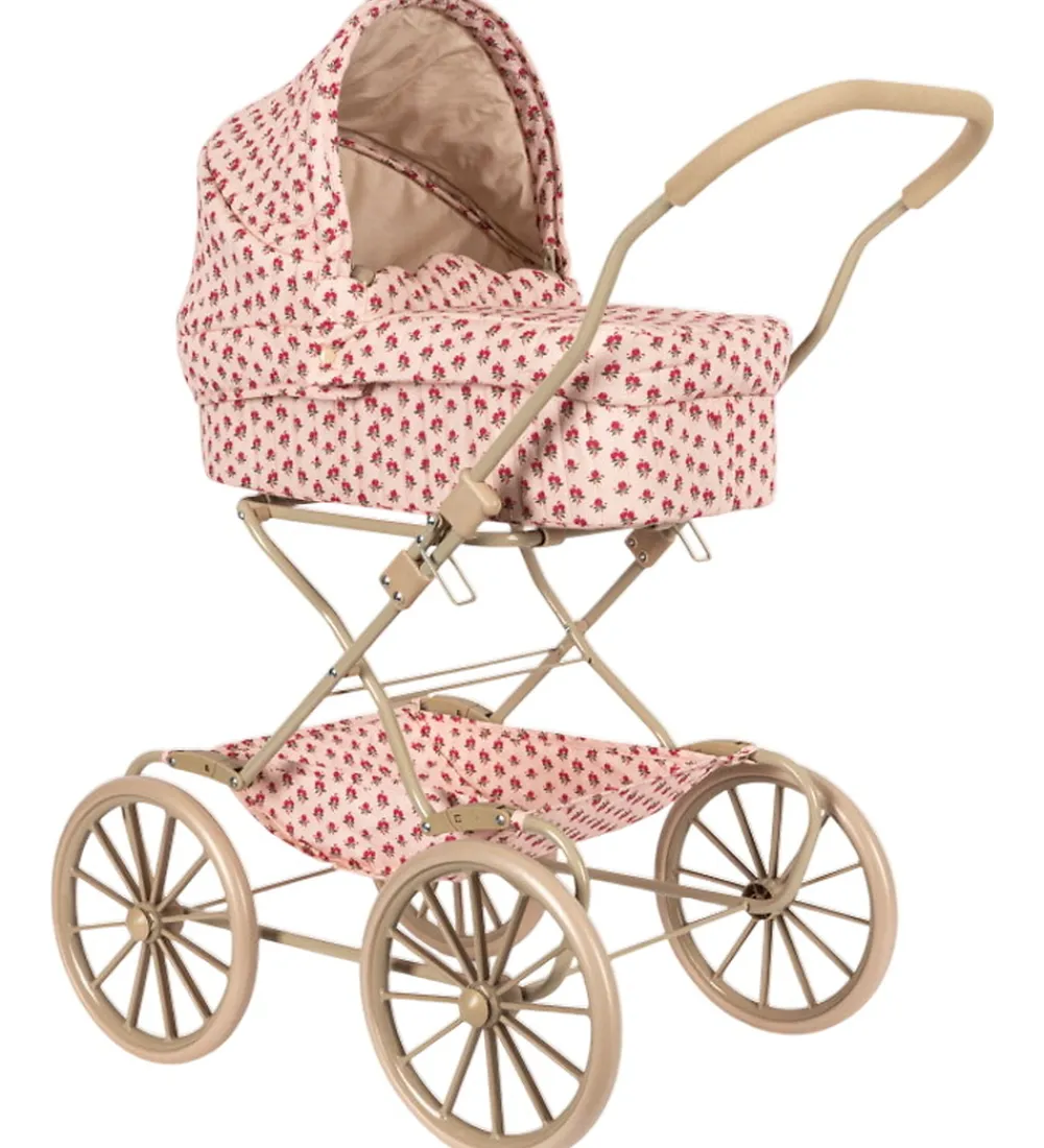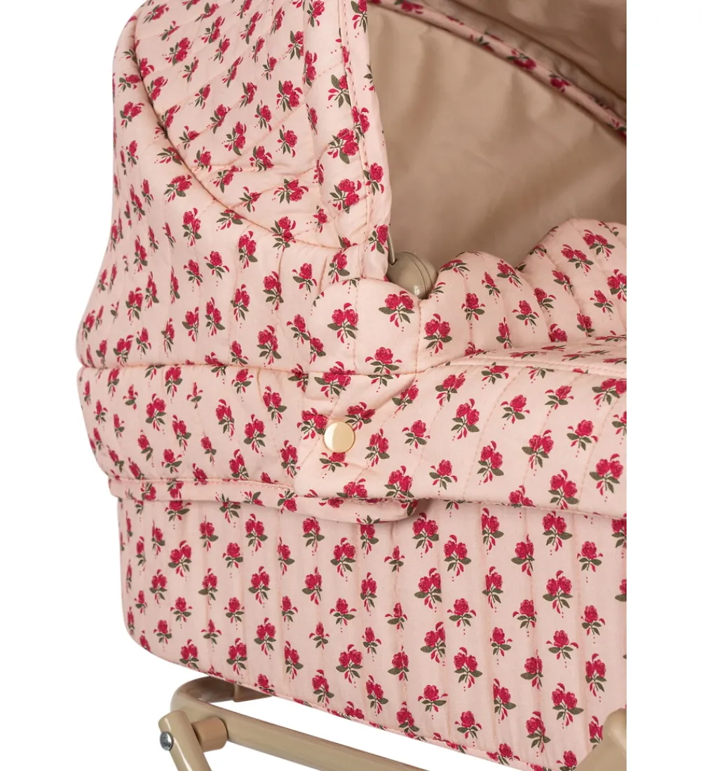 Fin Konges Sløjd dukkebarnevogn i en flot vintage-stil. Stoffet er lyserosa med et alloverprint af røde blomster og har en quiltet struktur samt bølgede scallop-kanter.
