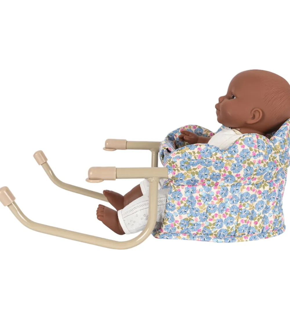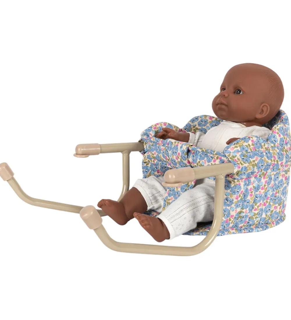 Konges Sløjd dukkeborstolen har et stållstel med et sæde af bomuld, og det monteres nemt på et bord, så dukken f.eks. kan sidde med ved spisebordet.