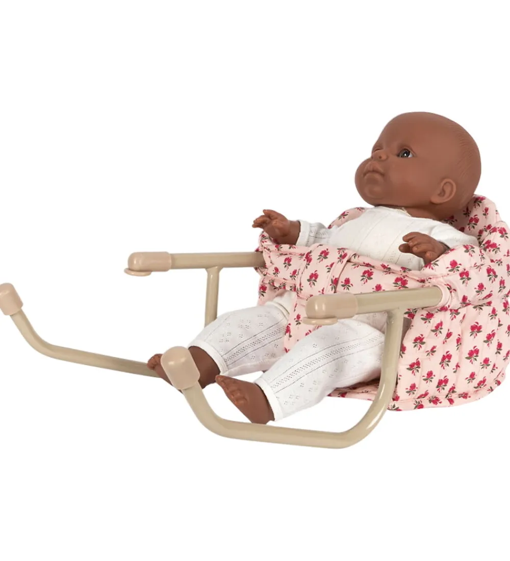 Konges Sløjd dukkeborstolen har et stållstel med et sæde af bomuld, og det monteres nemt på et bord, så dukken f.eks. kan sidde med ved spisebordet.