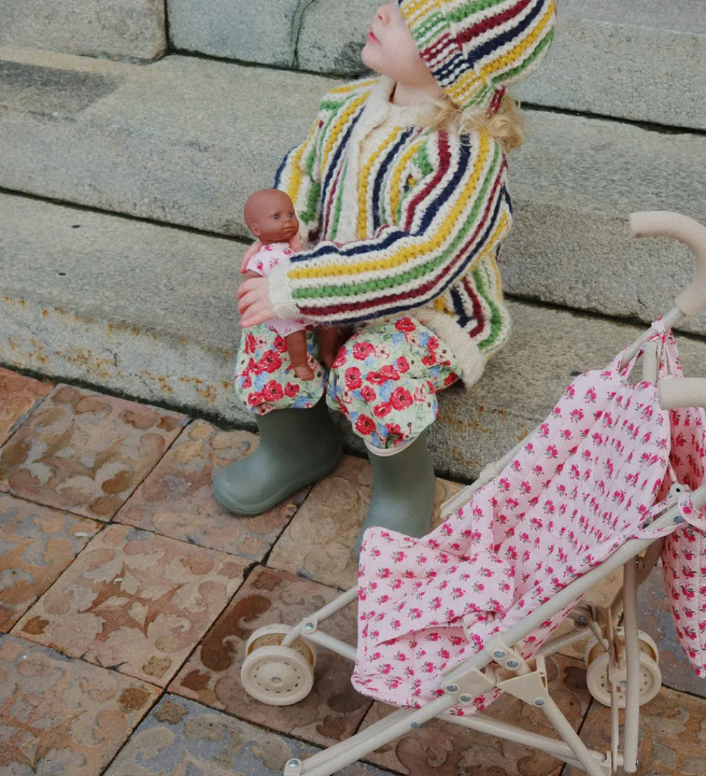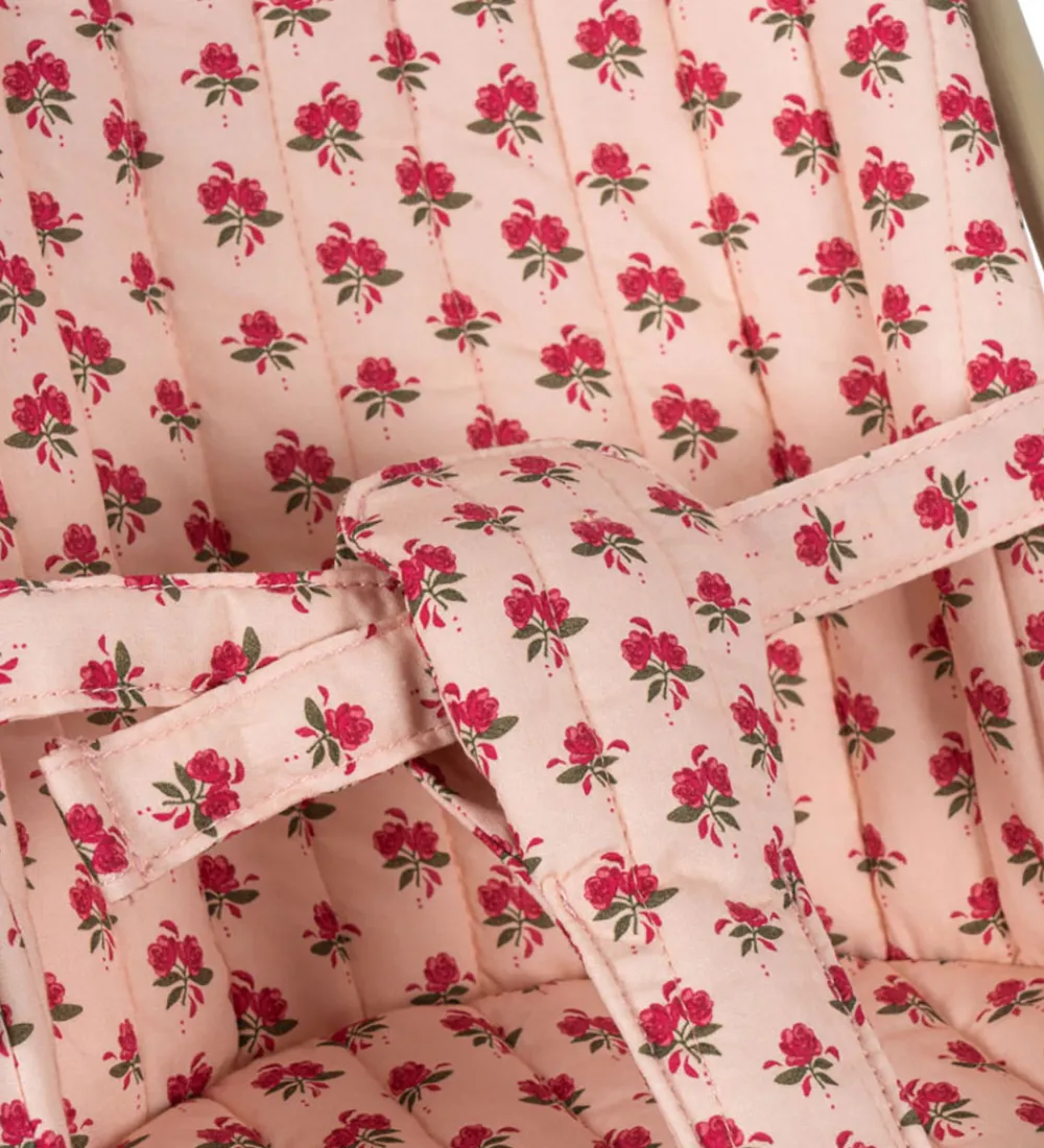 Smart Konges Sløjd dukkeklapvogn i lyserosa med et flot blomsterprint i røde nuancer.