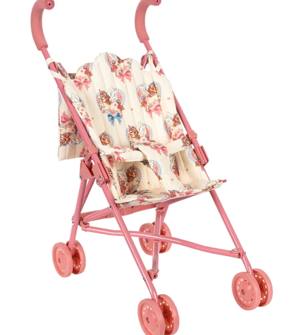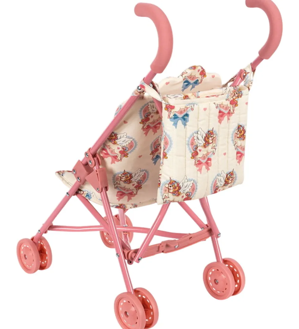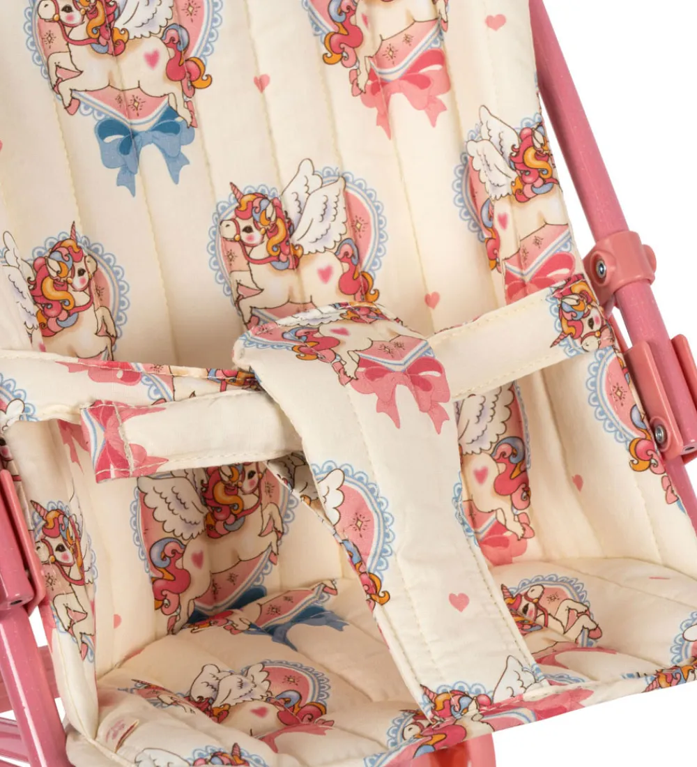 Fin Konges Sløjd dukkeklapvogn i lyserosa og beige med et flot unicornprint.