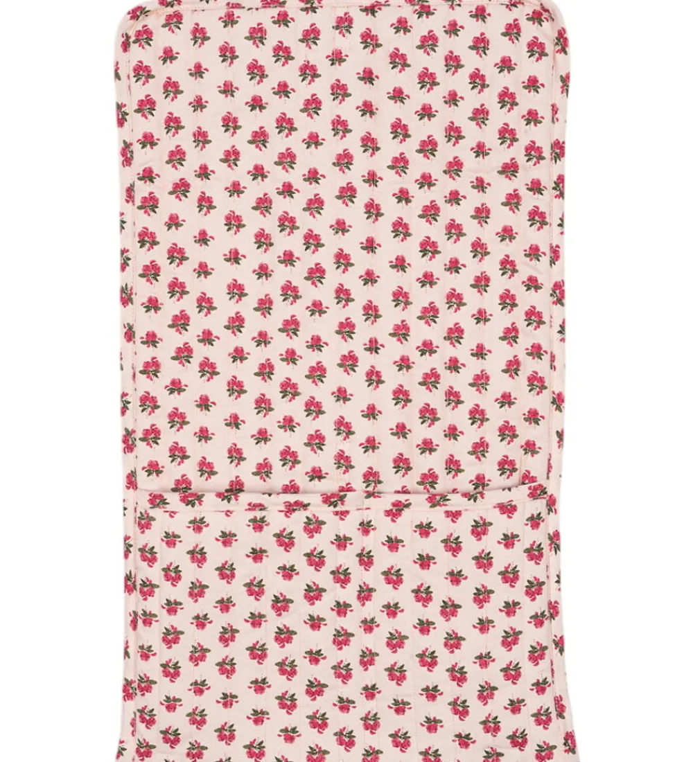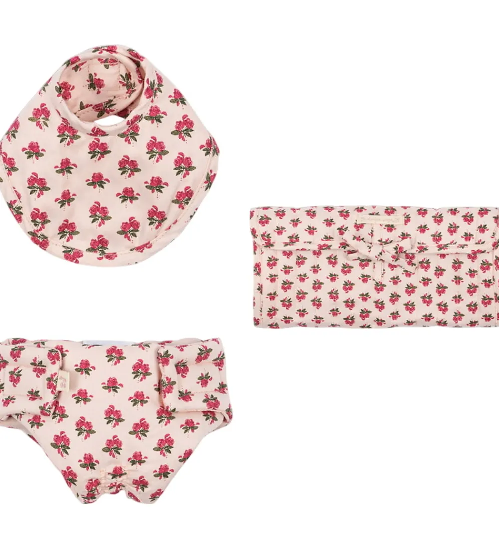 Smart dukketilbehør fra Konges Sløjd der består af et plejesæt i en blid rosa med et alloverprint af røde blomster. Plejesættet inkluderer en fin savlesmæk, en sød ble, og en blød bomuldsklud med mulighed for opbevaring.