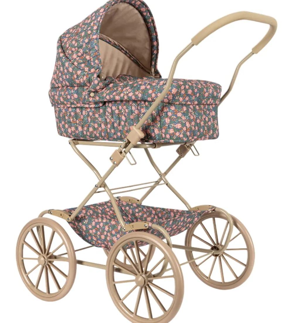 Flot Konges Sløjd dukkevogn i grøn med pink blomster.