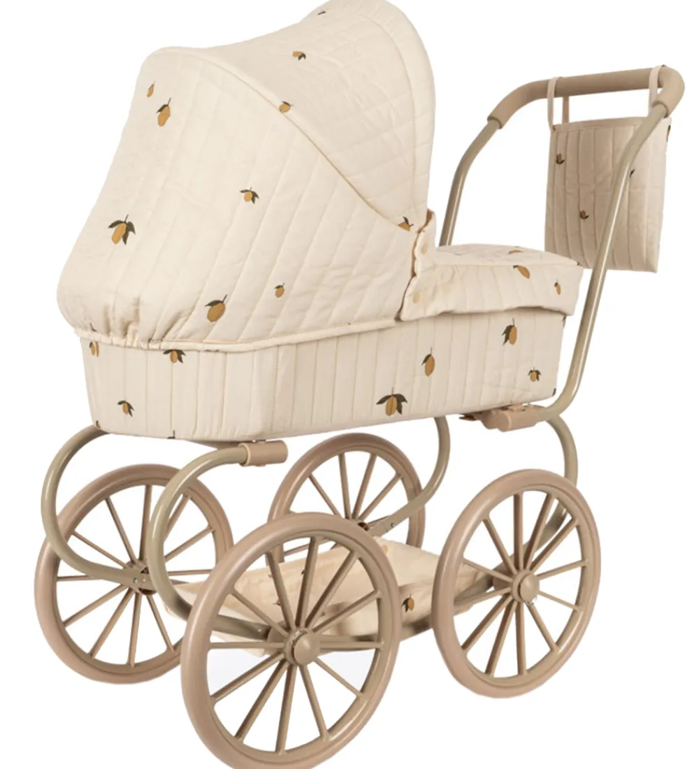 Pæn Konges Sløjd dukkebarnevogn i en flot vintage-stil. Stoffet er cremehvidt med print af små citroner over det hele og har en quiltet struktur og bølgede scallop-kanter.