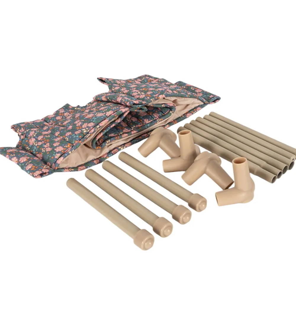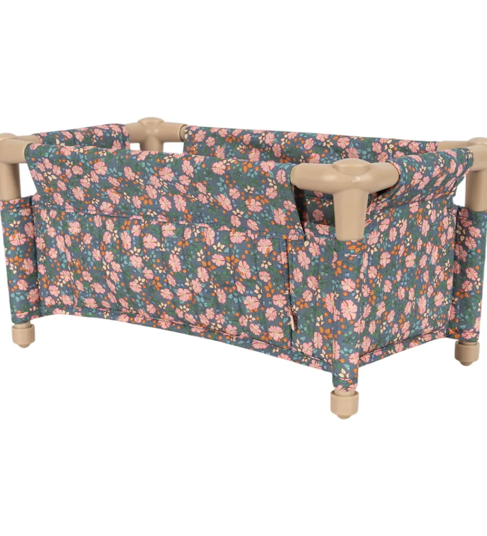 Flot Konges Sløjd rejseseng til dukker i grøn med pimk blomster.