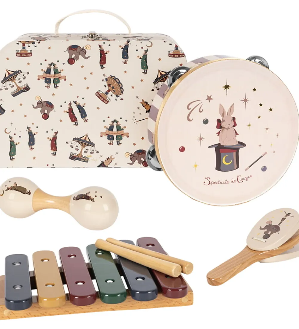 Fine musikinstrumenter fra Konges Sløjd i hvide og beige nuancer med smukke, klassiske cirkusprint.