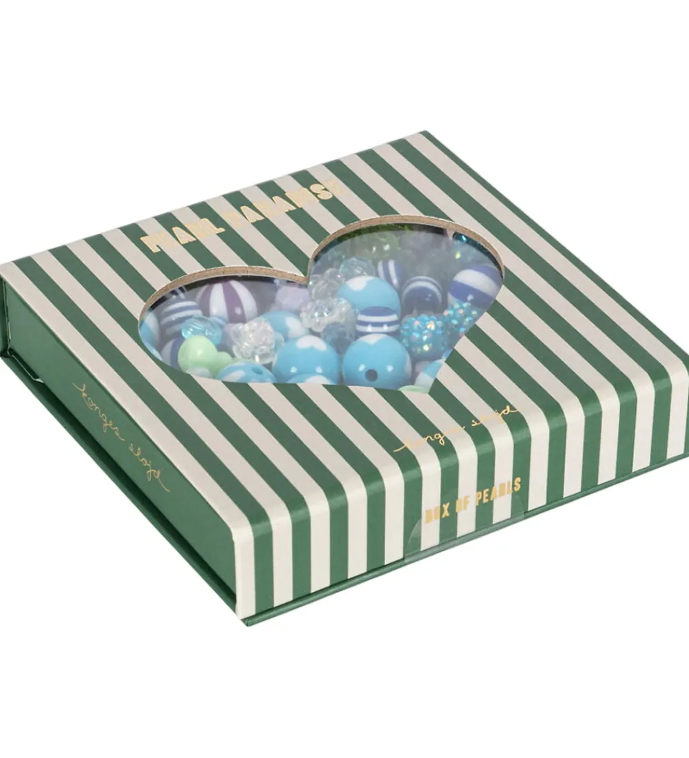 Farverige perler fra Konges Sløjd i blå nuancer, og som kommer i en grønstribet æske med hjerterude. Pakken indeholder 200 perler i forskellige former og størrelser, der indbyder til kreativ leg og smykkedesign, samt 10 meter snor. En fantastisk tilføjelse til ethvert kreativt projekt.