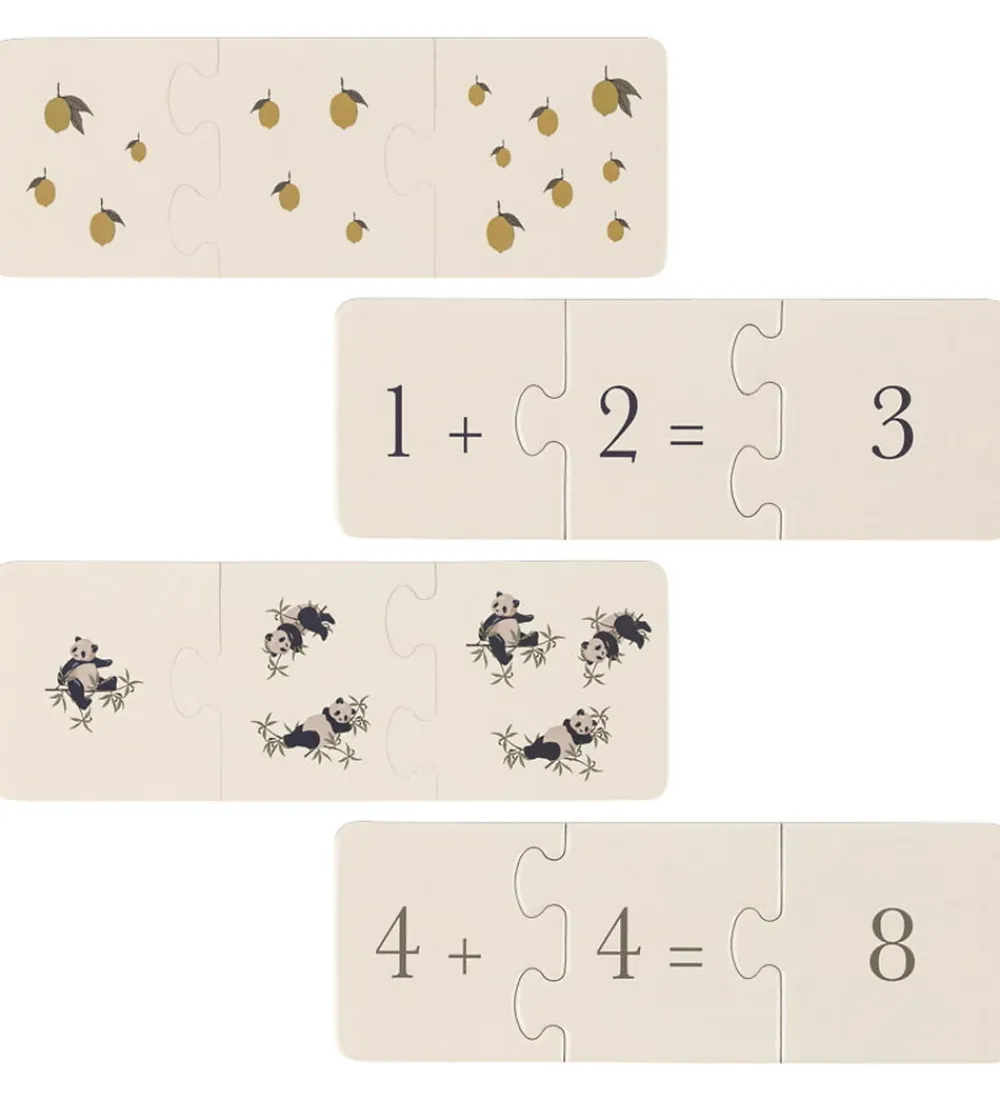 Charmerende Konges Sløjd puslespil i lysebeige med søde panda- og citronmotiver samt simple regnestykker. Konges Sløjd puslespillet er perfekt til at støtte dit barns læring gennem leg og visuel stimulering.