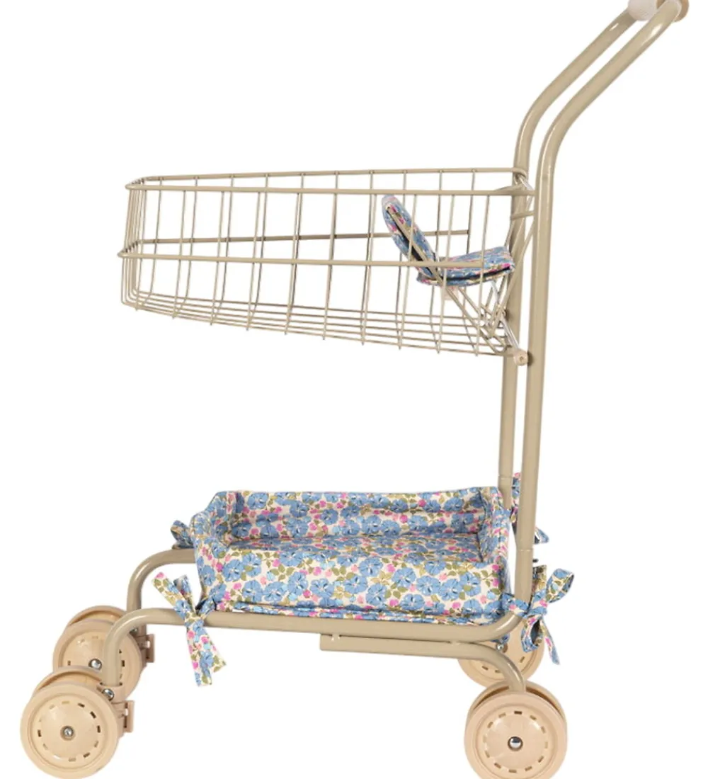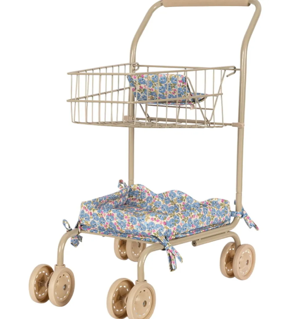 Fin Konges Sløjd indkøbsvogn i beige med et farverigt alloverprint af små blomster på sædet og puden.