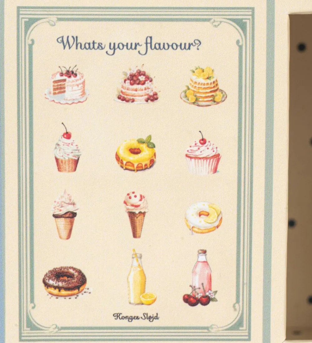 Charmerende Konges Sløjd legetøj udformet som et lille bageri i lyseblå med striber. Legetøjet inkluderer en sød bamse iført en blåstribet kjole, to kager og en sodavand, som skaber en hyggelig atmosfære. Oplev fantasifuld leg med Konges Sløjd.