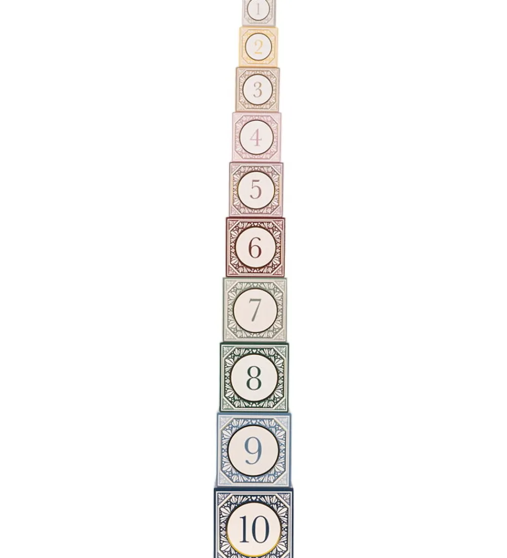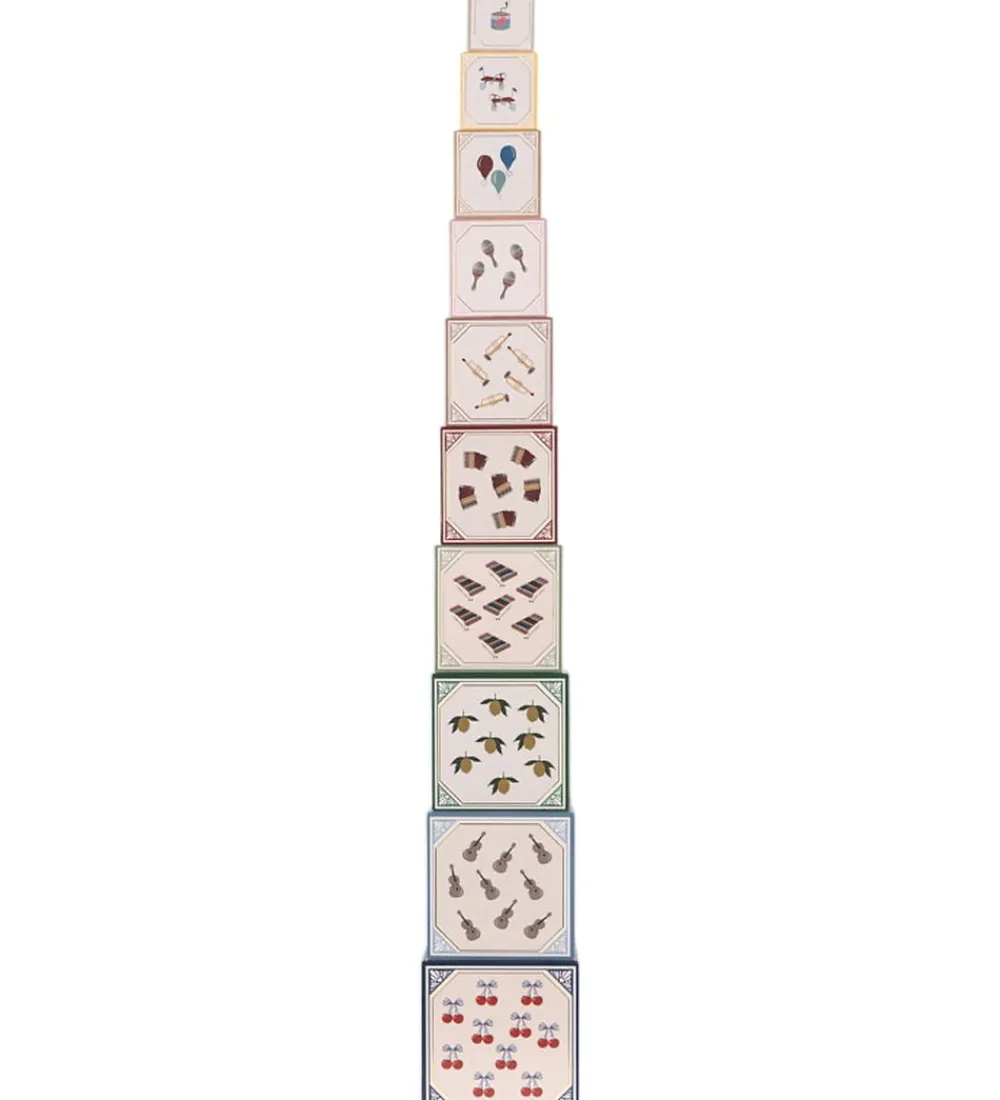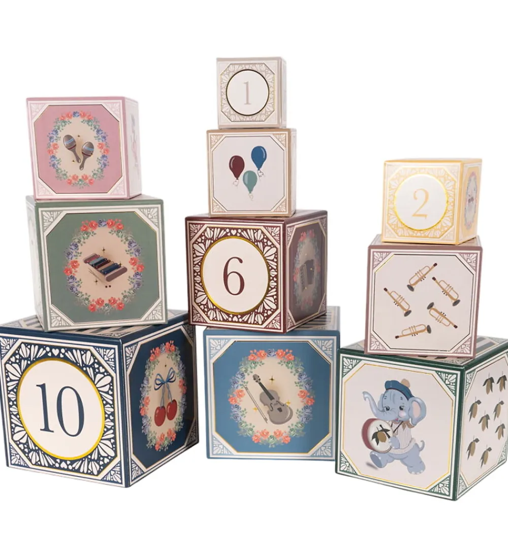Farverige Konges Sløjd stableklodser med unikke prints af elefanter, balloner og musikinstrumenter samt tallene fra 1-10.