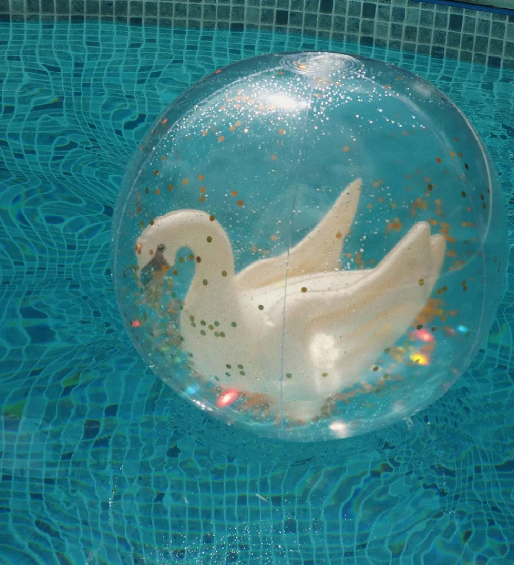 Sjov Konges Sløjd badebold i transparent med en hvid svane og konfetti indeni. Badebolden er god til vandleg og hygge på stranden eller ved poolen.