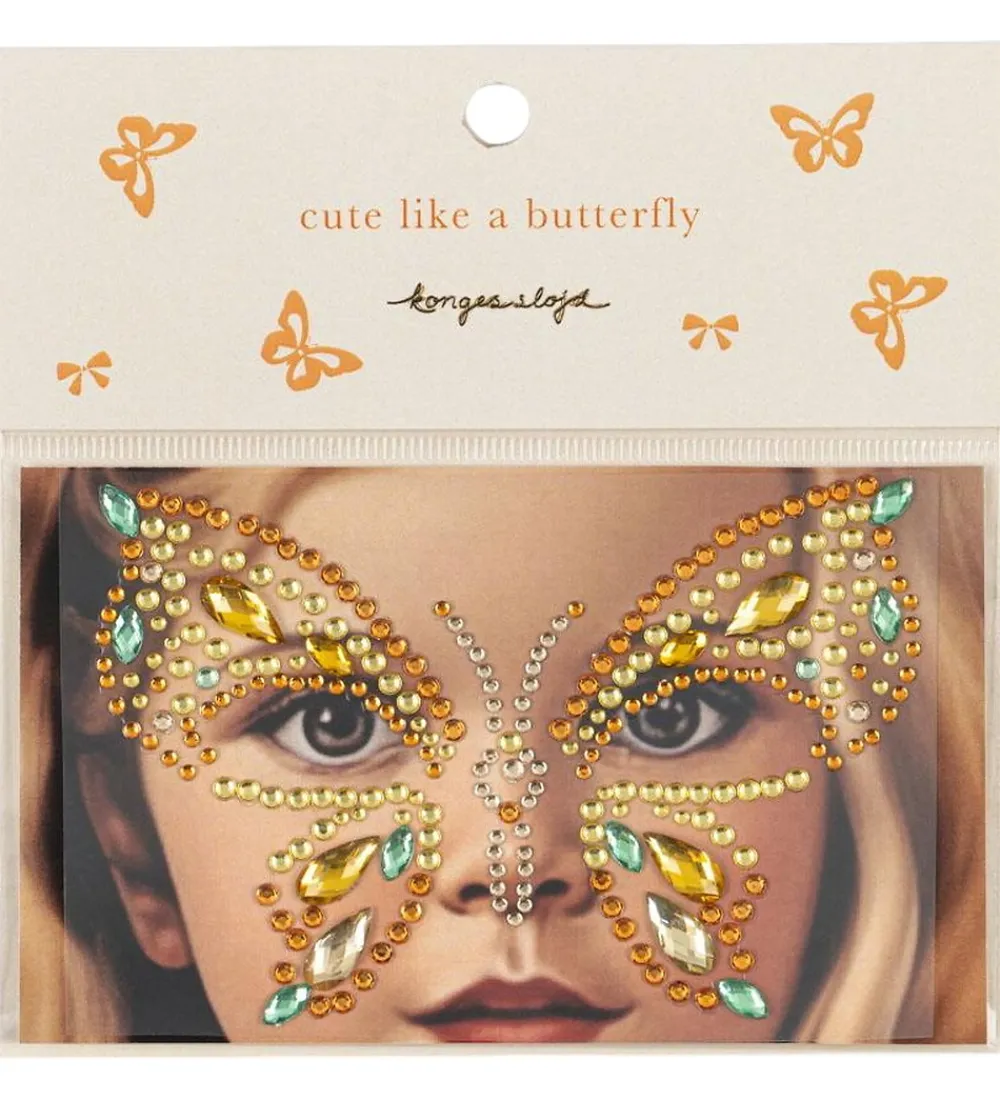 Fine Konges Sløjd ansigtssmykker med små plastikjuveler i skinnende orange, gule og grønne farver, som kan danne en sommerfugl.