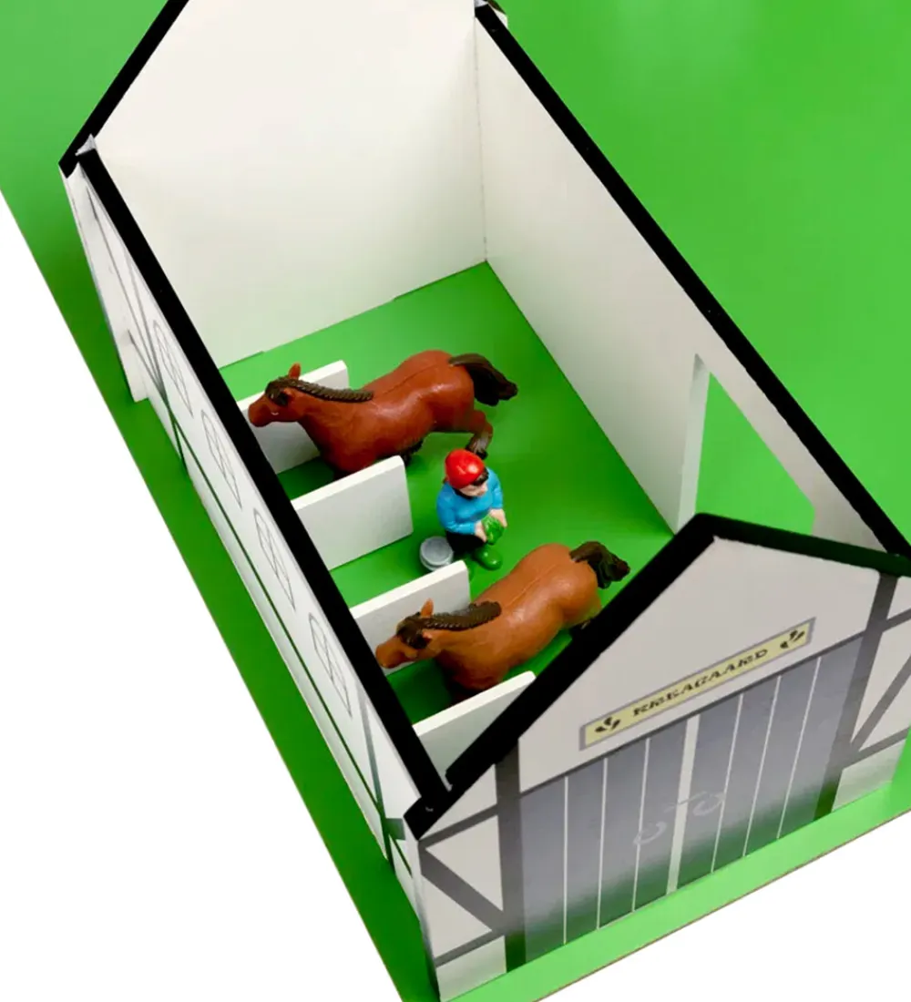 Krea bondegåden består af et hovedhus samt en lade og en stald, og i det ene hjørne er der en hyggelig indhegning til dyrene. Bygningerne kan sættes fast på pladen, så de ikke rutsjer rundt, og pladen kan foldes sammen, så den ikke fylder så meget. Tagene på bygningerne kan løftes af, så det er let at komme til at lege med bondegårdsdyr og dukker indeni bygningerne.