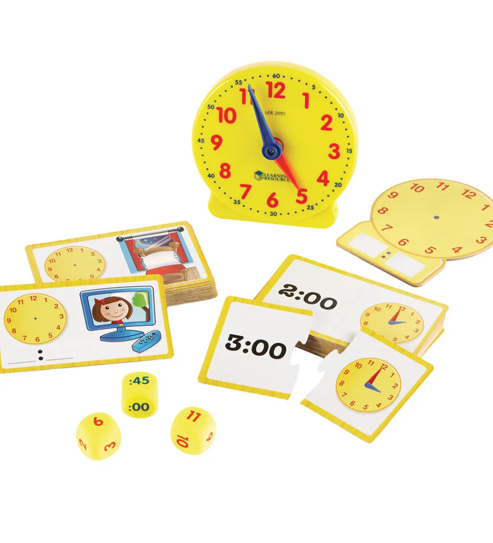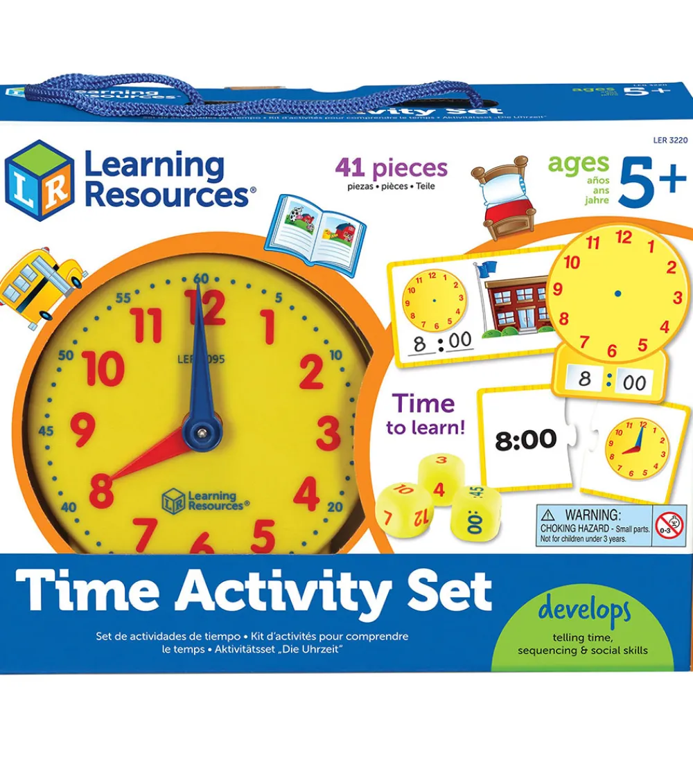 Skønt Learning Resources aktivitetslegetøj med et ur i gul. Sættet indeholder 41 dele, der hjælper med at udvikle tidsforståelse, sekvensering og sociale færdigheder hos børn.
