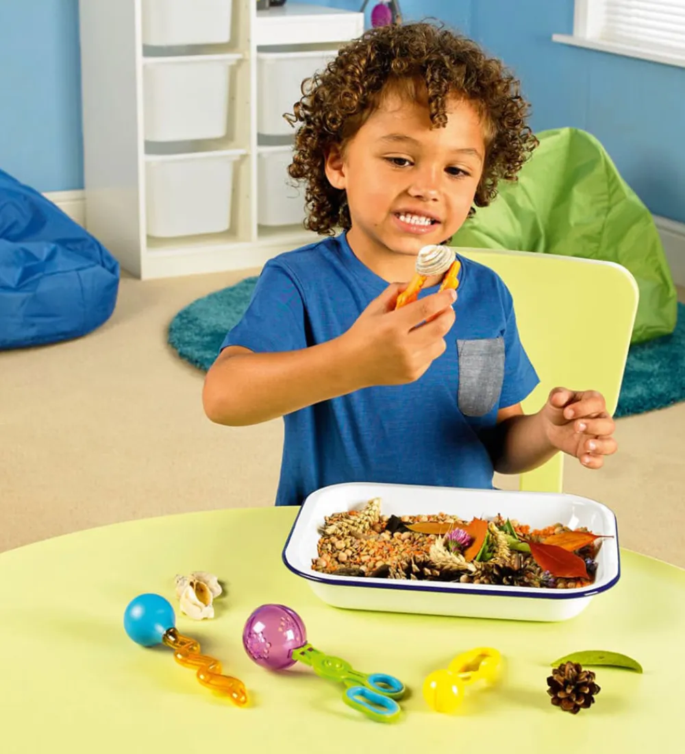 Farverigt Learning Resources aktivitetslegetøj, med fire forskellige dele, som er designet til at styrke børns finmotorik. Sættet indeholder fire værktøjer, som kan klemme, opsamle, slippe og gribe.