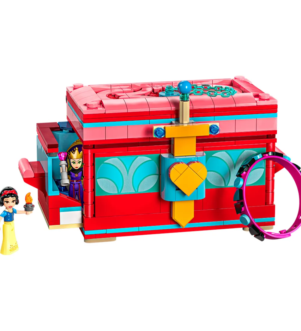 LEGO® Disney sættet er det perfekte legetøj til det kreative barn, der vil bygge og lege med sættet, som indeholder et smykkeskrin, der kan bygges, med låsbart låg, armbånd, masser af udsmykningselementer og minidukkefigurer af Snehvide og den onde dronning.