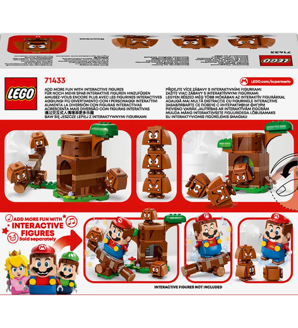I dette sæt skal kan man stable de tre Goomba’er ovenpå hinanden, trykke på udløseren bag på træstammen, der kan bygges, for at få en Goomba til at poppe ud, eller lege med Goomba’erne på vippen.