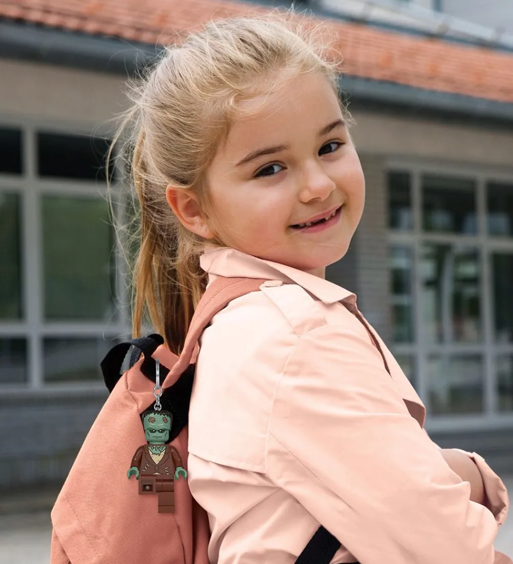 LEGO® nøgleringen kan bruges som en smart lommelygte ved at trykke på maven. Den har en kæde med en spiralring, så den nemt kan hænges på eksempelvis skoletasken eller sammen med nøglerne. LEGO® figuren kan bevæge hoved, arme og ben.