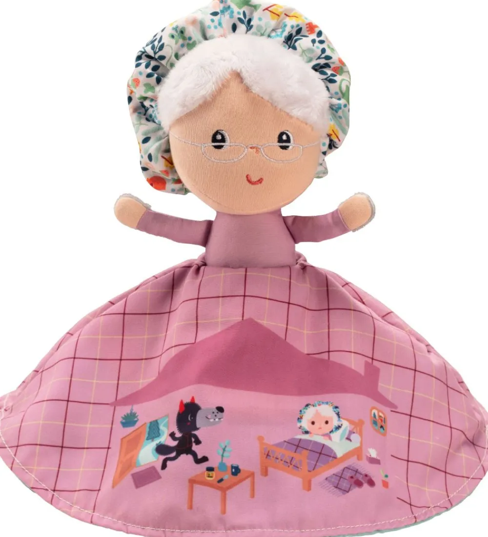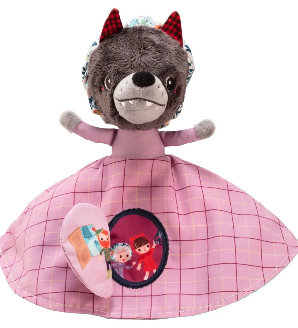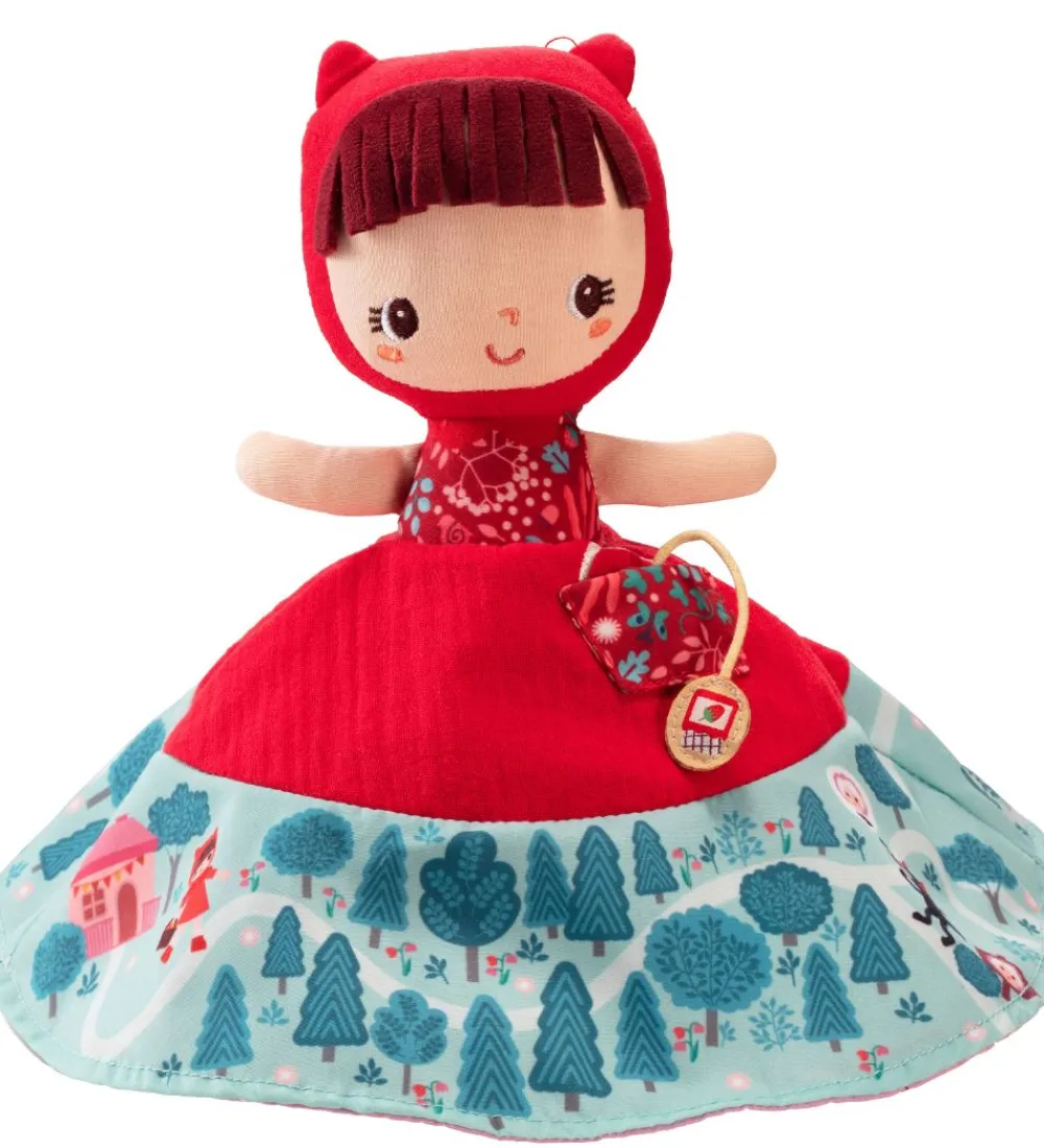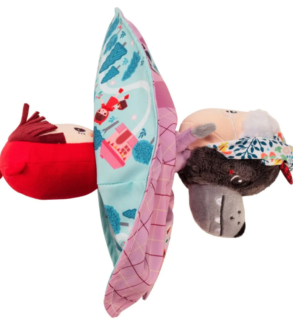 Spændende Lilliputiens aktivitetsbamse som forestiller rødhætte i den ene ende, og bedstemoren og ulven i den anden ende. Rødhætte har en fin rød hætte og kjole på, og på kjolen er der et fint print i bunden som fortæller historien og rødhætte og ulven. Når kjolen flippes om så bliver den rosa, og historien om rødætte og ulven fortsætter på skørtet. Hovedet er delt i to, hvor den ene side forestiller bedstemoren med en hætte på, og den anden side forestiller ulven.