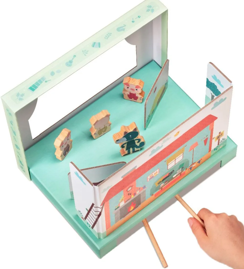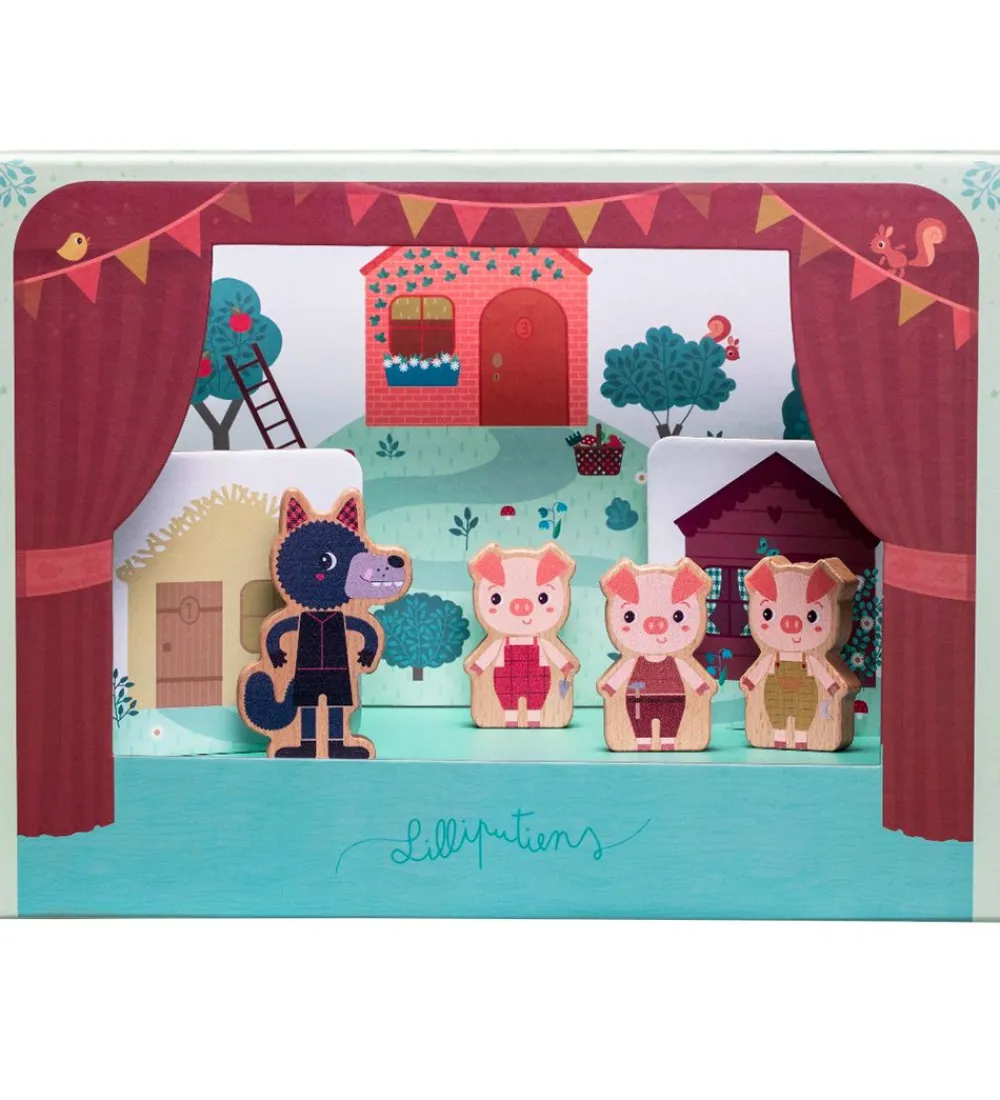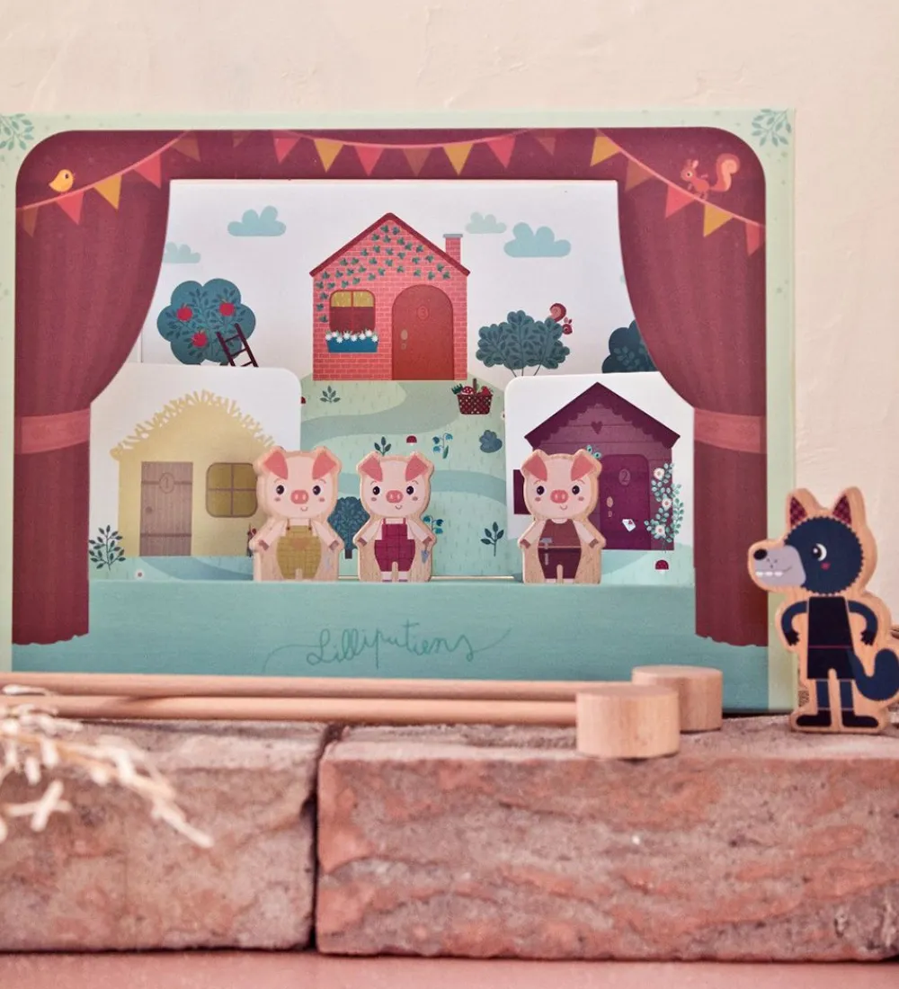 Lilliputiens aktivitetslegetøjet er en sjov stilsiddende aktivitet. Med dette sæt, kan man være med til at omskrive eller skrive sit eget eventyr om de tre små grise og ulven. Det hele kan samles, så det ligner at der bliver opført et teaterstykke. Med de to pinde med magneter kan de fire figurer styres bagfra scenen, da de alle har magneter under fødderne.