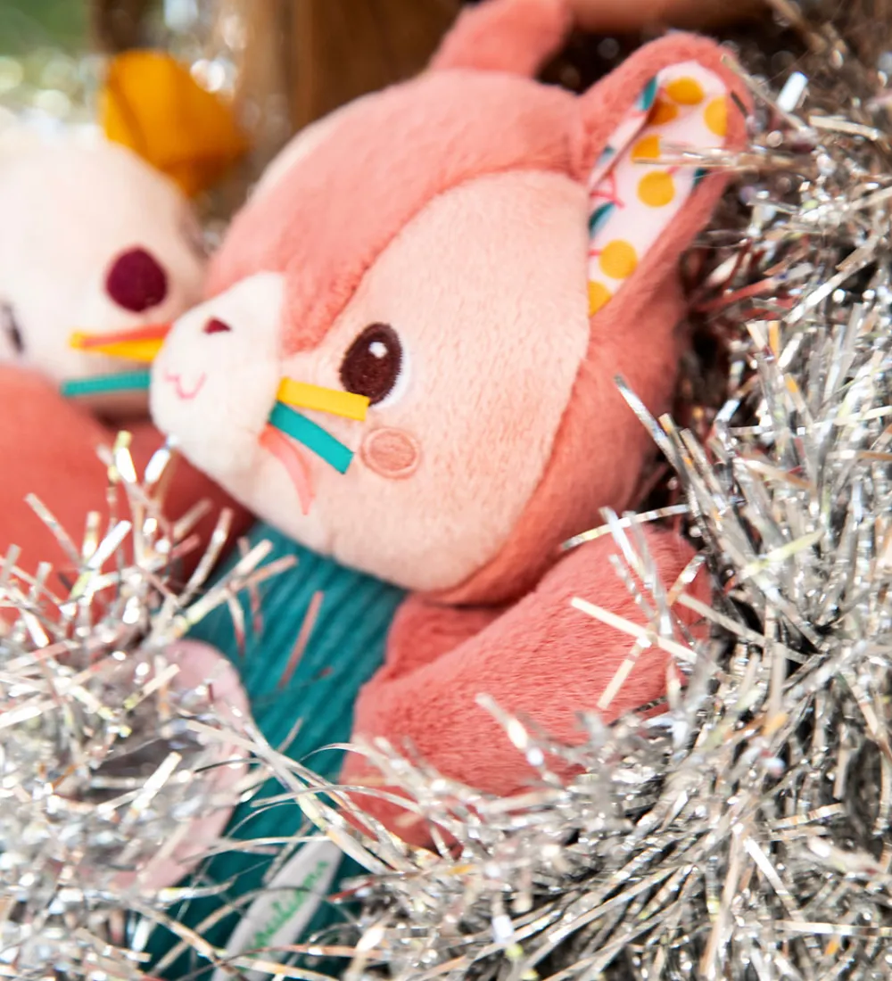 Charmerende aktivitetslegetøj fra Lilliputiens i form af katten Jeanne i rosa og grøn med et spejl på maven og en snor i hånden med en rangle formet som en mus. Katten siger en beroligende raslelyd, når man ryster den.