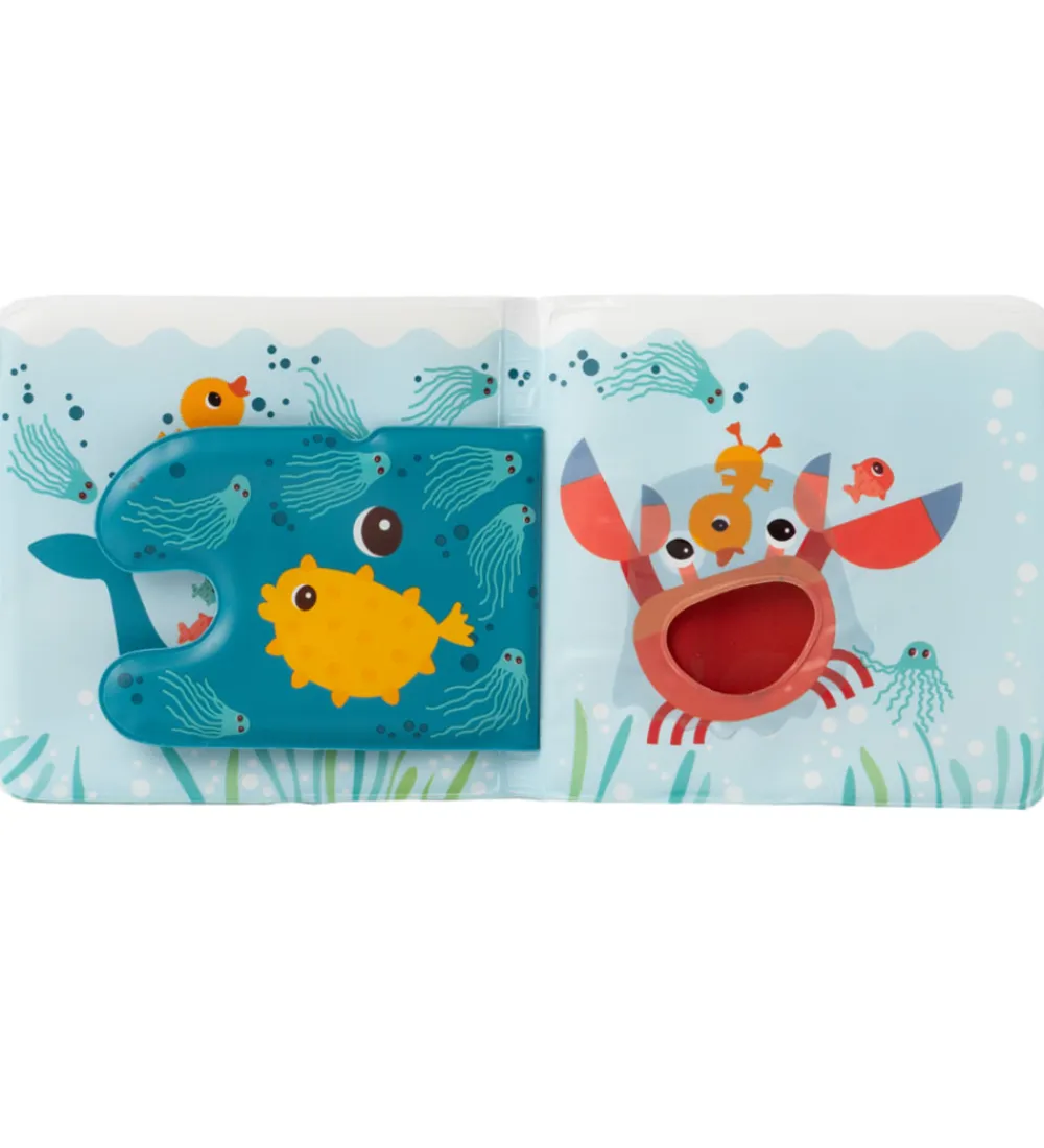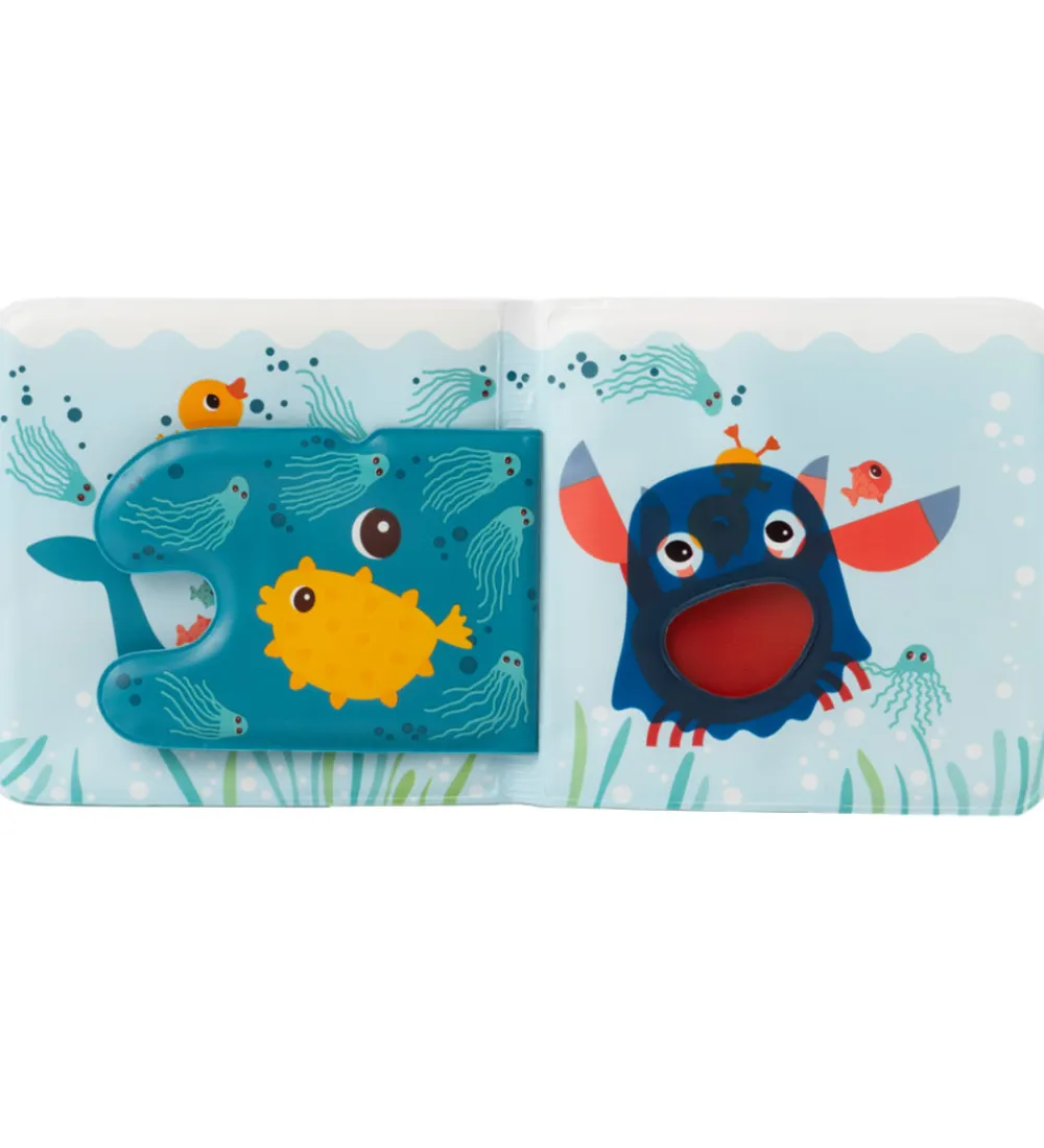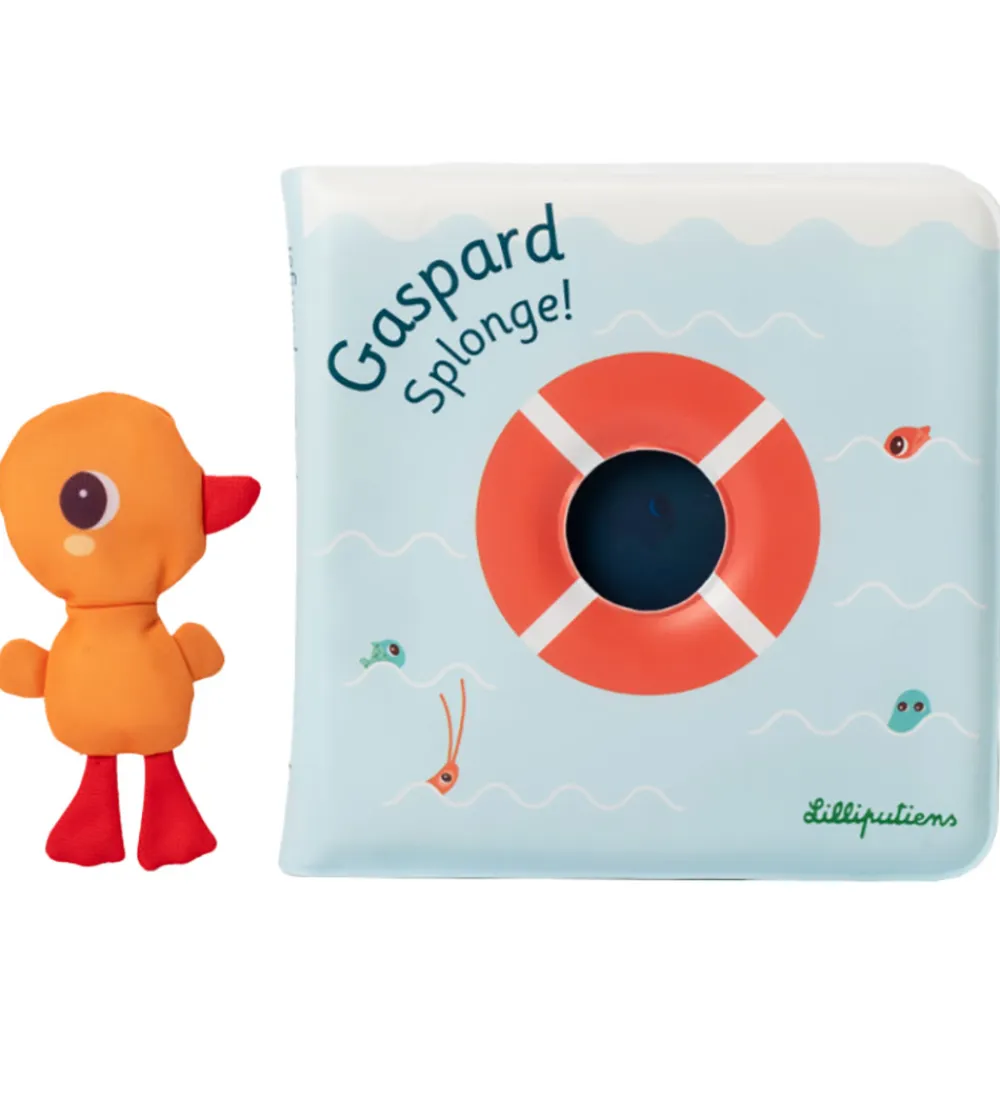 Lilliputiens badebogen er i et vandtæt materiale og fuld af sjove detaljer, der kan leges med i badet. Gaspard kan stikke sit hoved ud gennem forsiden, og badebogens illustrationer ændrer sig på magisk vis, når de kommer i kontakt med vand, der er varmere end 32 grader.