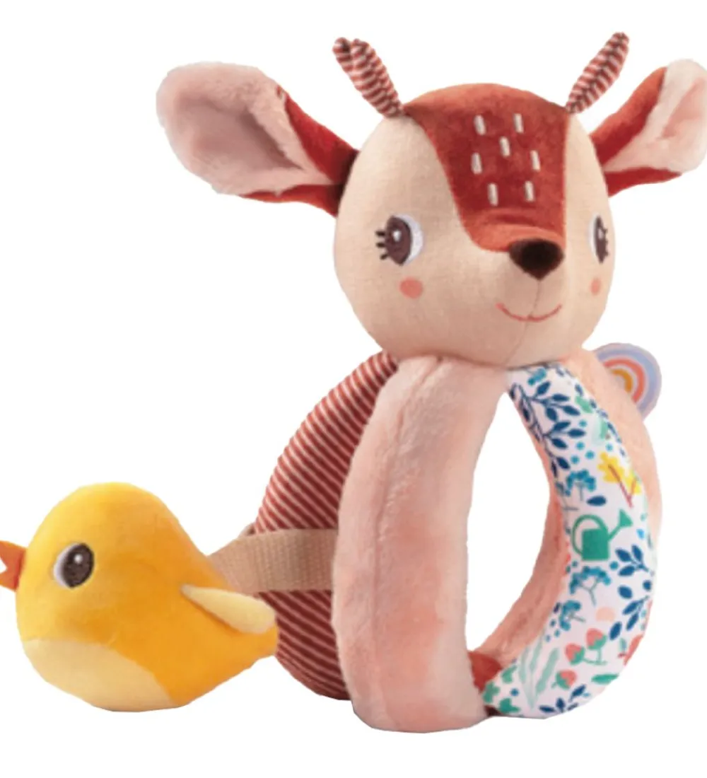 Spændende Lilliputiens aktivitetslegetøj med form som en bambi, hvor en gul fugl gemmer sig bag håndtagene til ranglen.