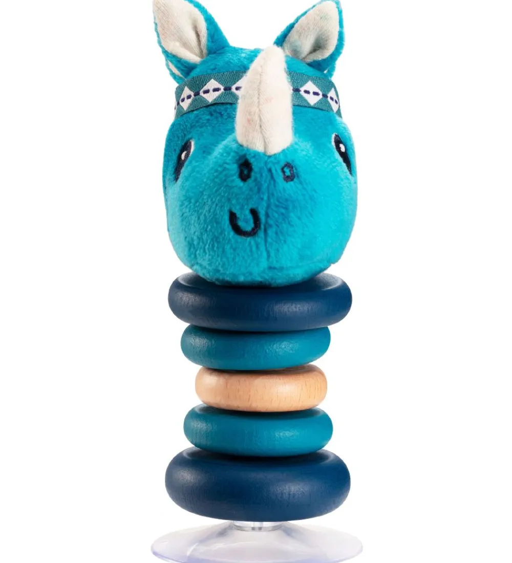 Fin Lilliputiens rangle i blå med et næsehorn-hoved på toppen med træ-ringe i naturligt træ og blå.