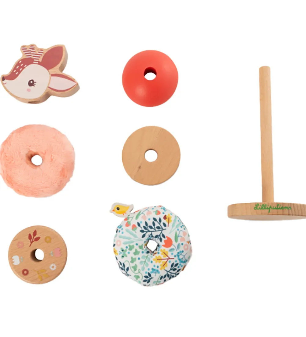 Lilliputiens stabletårn har ringe i træ og tekstil med forskellige strukturer, der sættes på stabletårnet. Stabletårnet er sjovt at lege med for det lille barn og stimulerer sanserne.