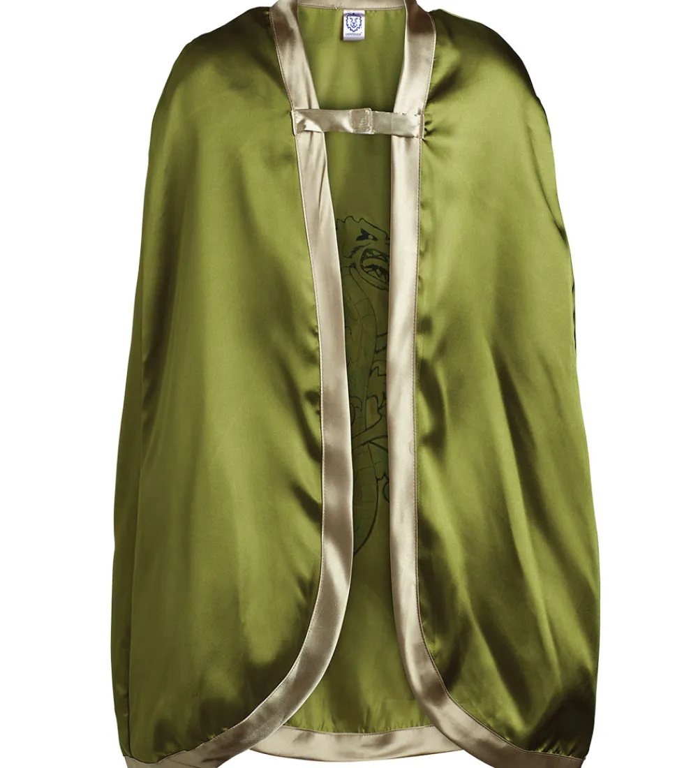 Smart Liontouch dragekappe i skinnende grøn med et stort drageprint på ryggen. Dragekappen lukkes fortil med en velcrolukning.