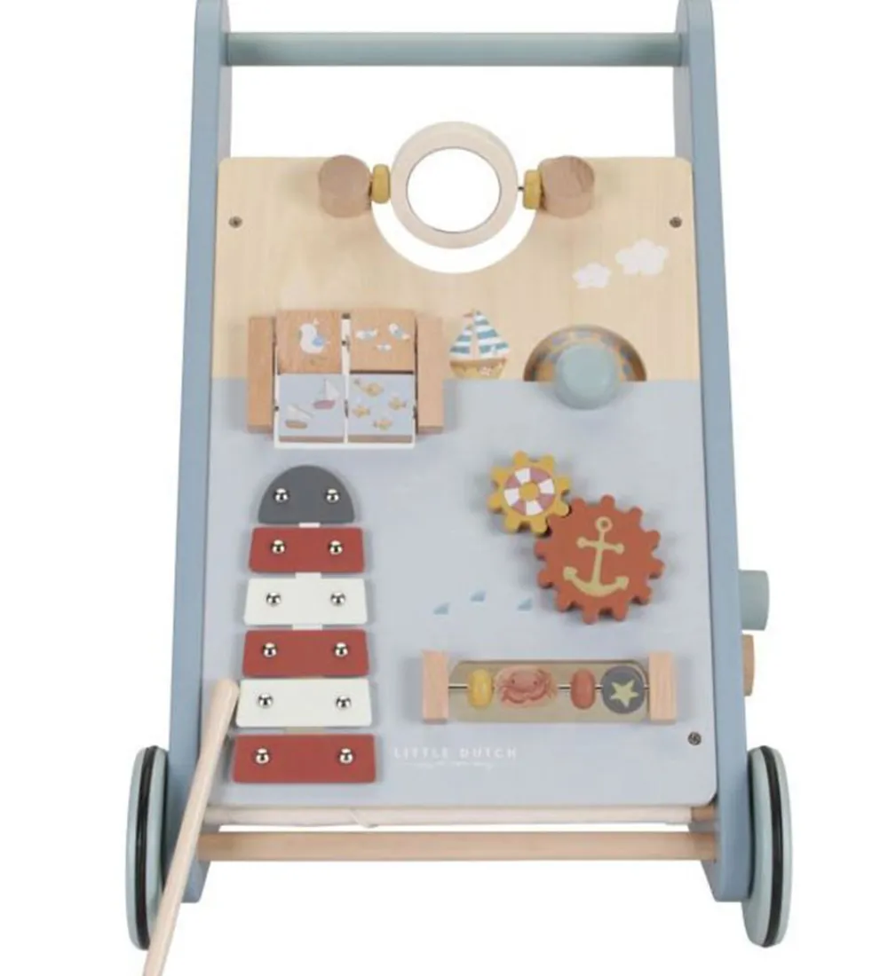 Smart Little Dutch gåvogn i naturligt træ og blå. Gåvognen har aktiviteter i forskellige farver.