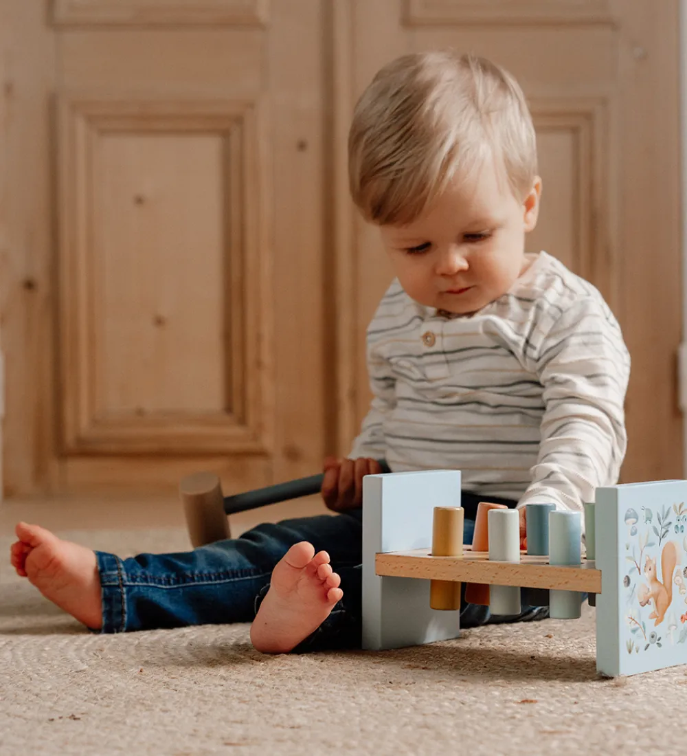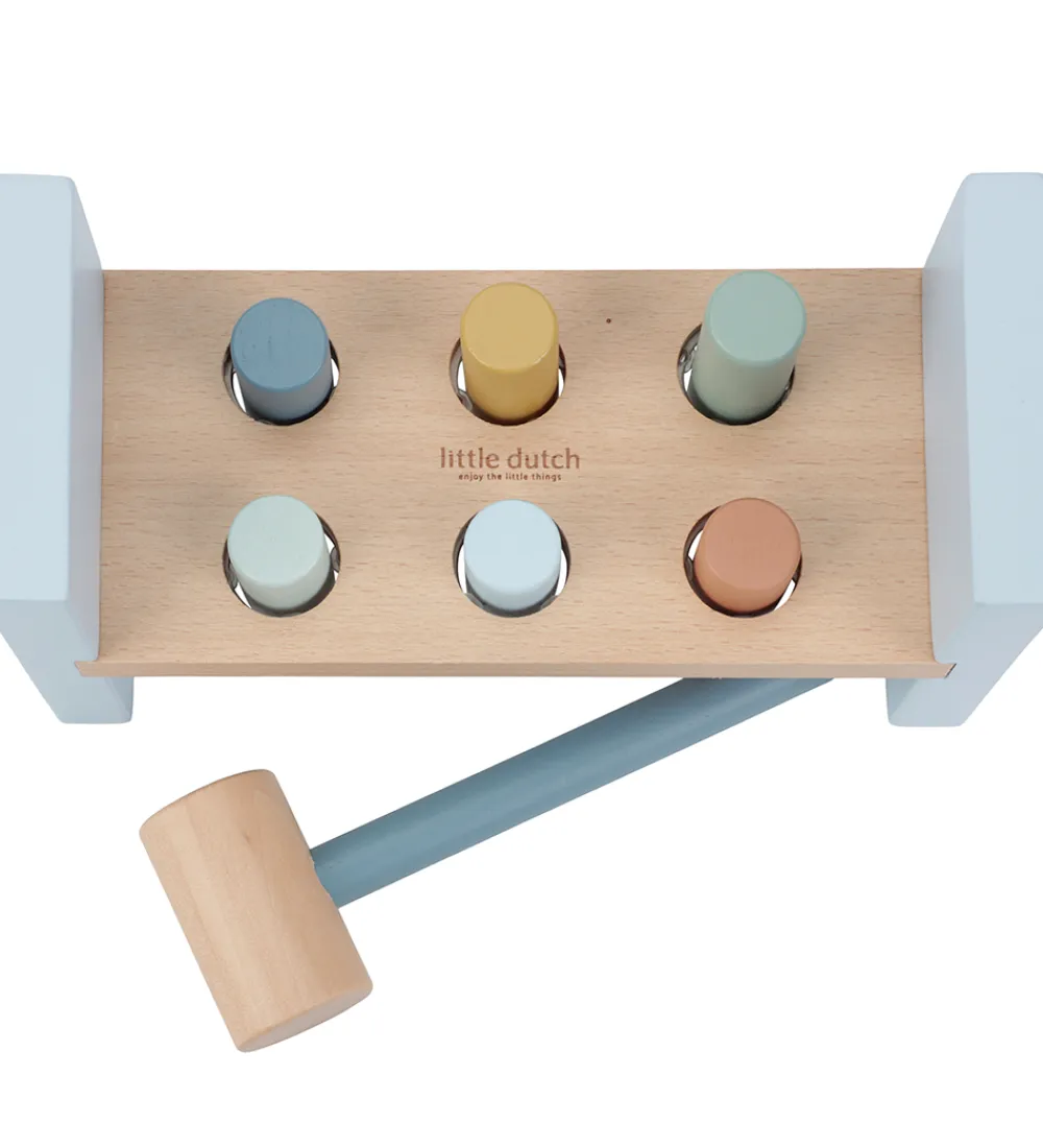 Little Dutch hammerbrættet er et klassisk stykke legetøj, hvor pindene hamres igennem hammerbrættet med den medfølgende træhammer.Hammerbrættet kan vendes om, og legen kan gentage sig.