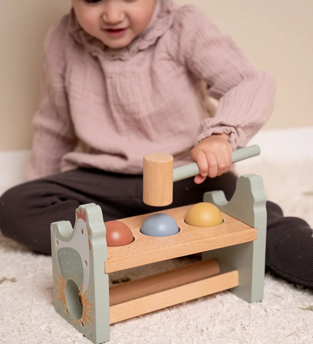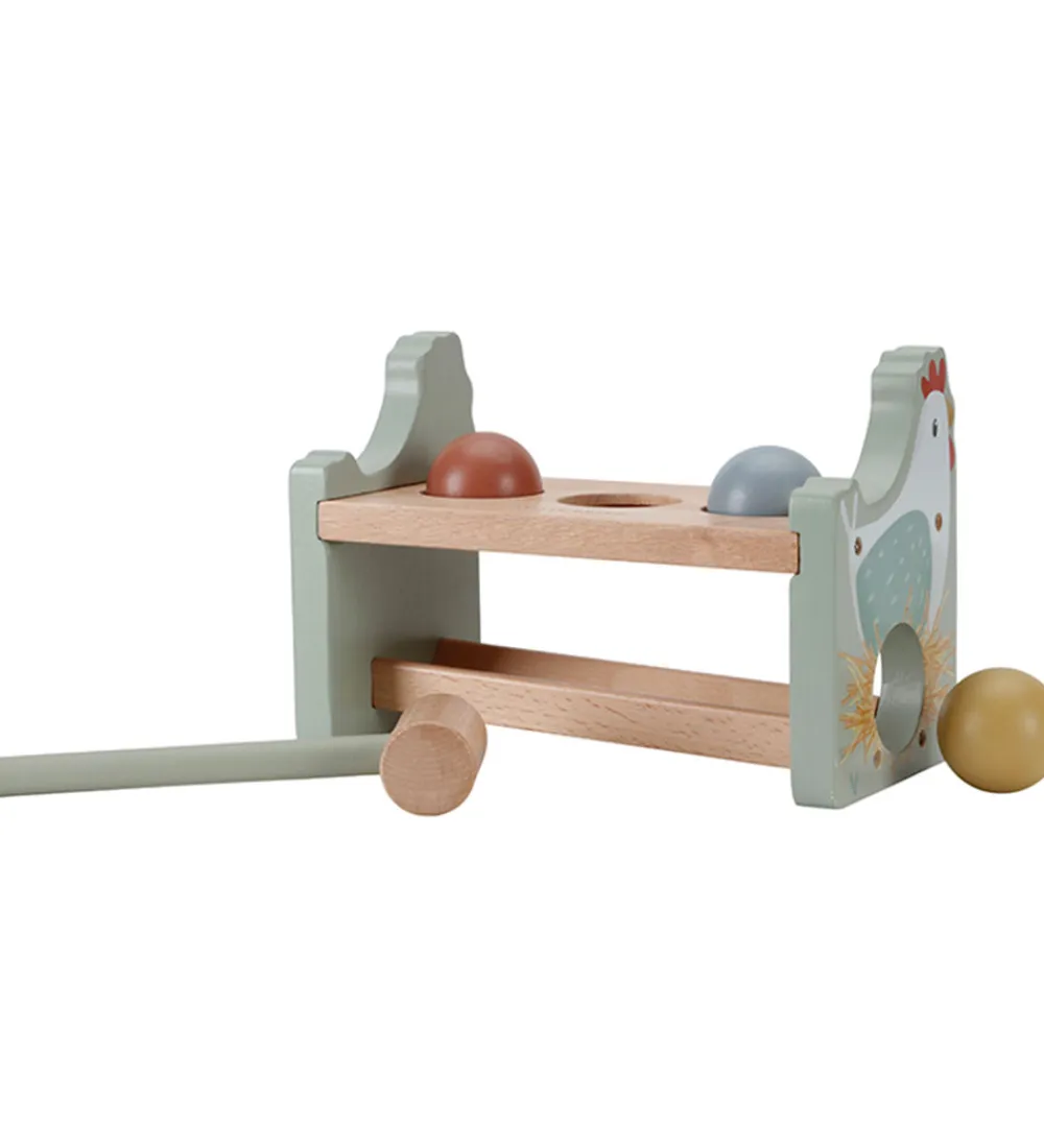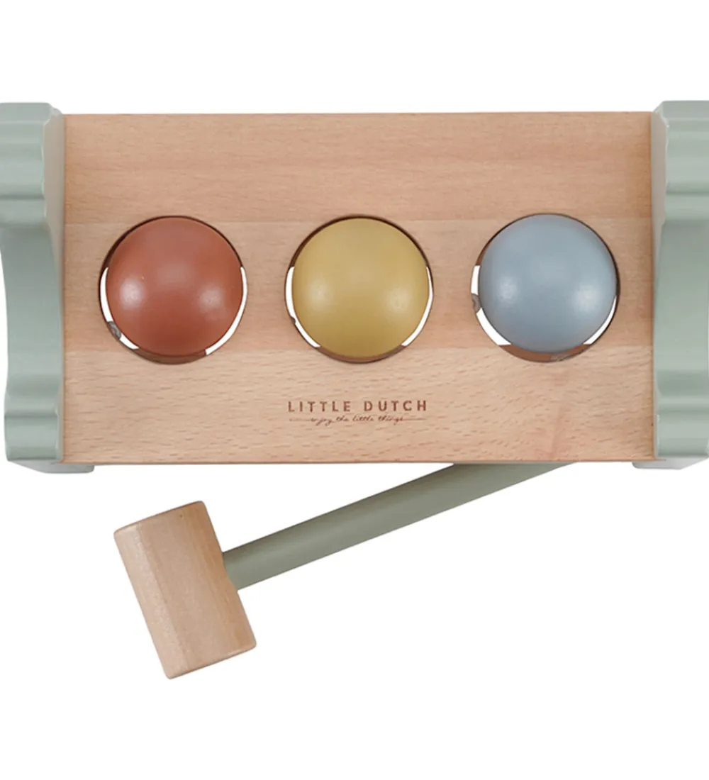 Little Dutch hammerbrættet er et klassisk stykke legetøj, hvor kuglerne hamres igennem hammerbrættet med den medfølgende træhammer. Kuglerne opfanges under brættet og ruller til siden, så det ligner, at der kommer æg i hønens rede på siden af hammerbrættet.