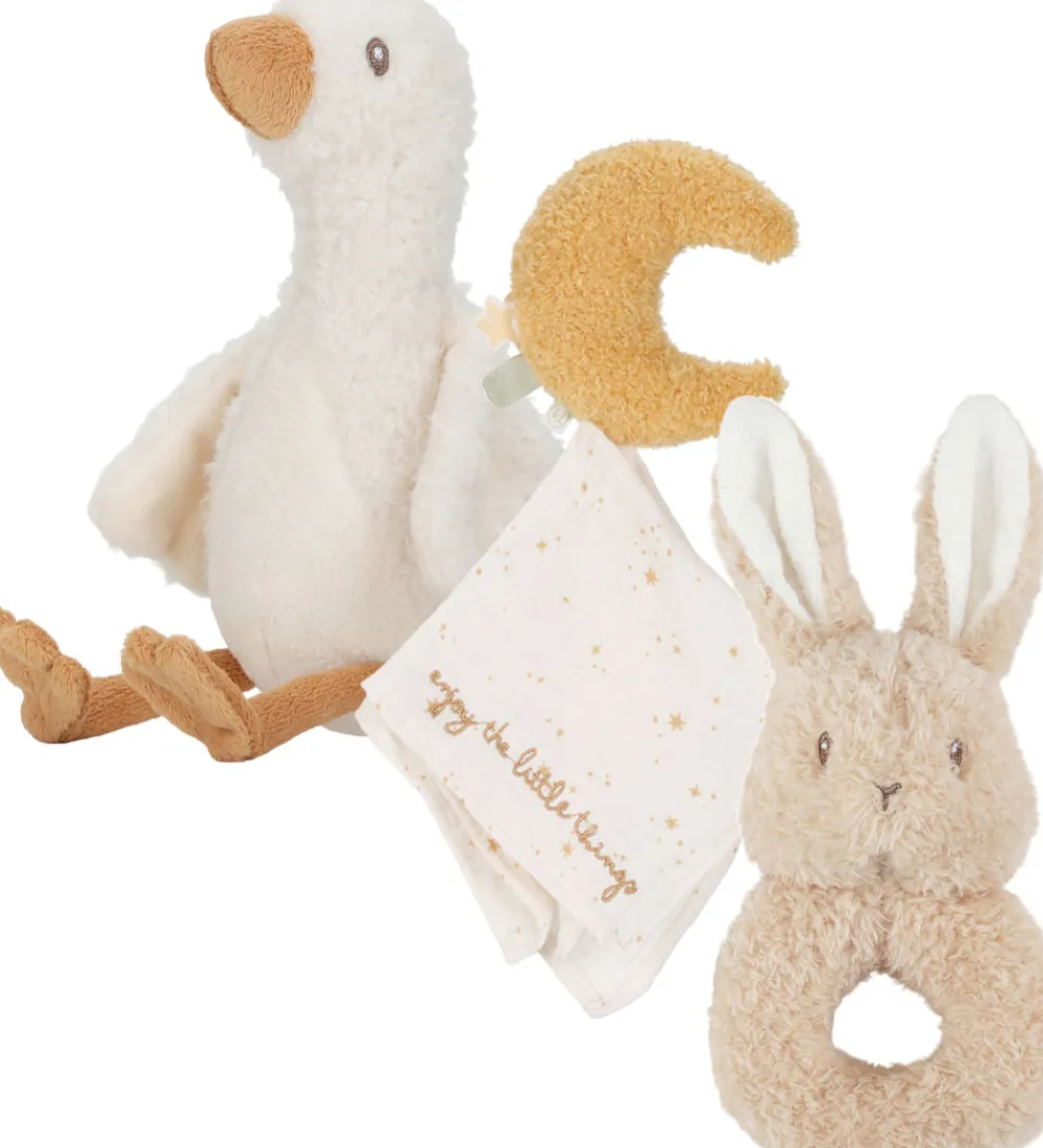 Charmerende gaveæske fra Little Dutch der består af en nusseklud med en måne, en bamse formet som en and, og en rangle med raslelyd og kintrerpapir der er formet som en kanin. Little Dutch gaveæsken er den perfekte gave til den lille nyfødte.