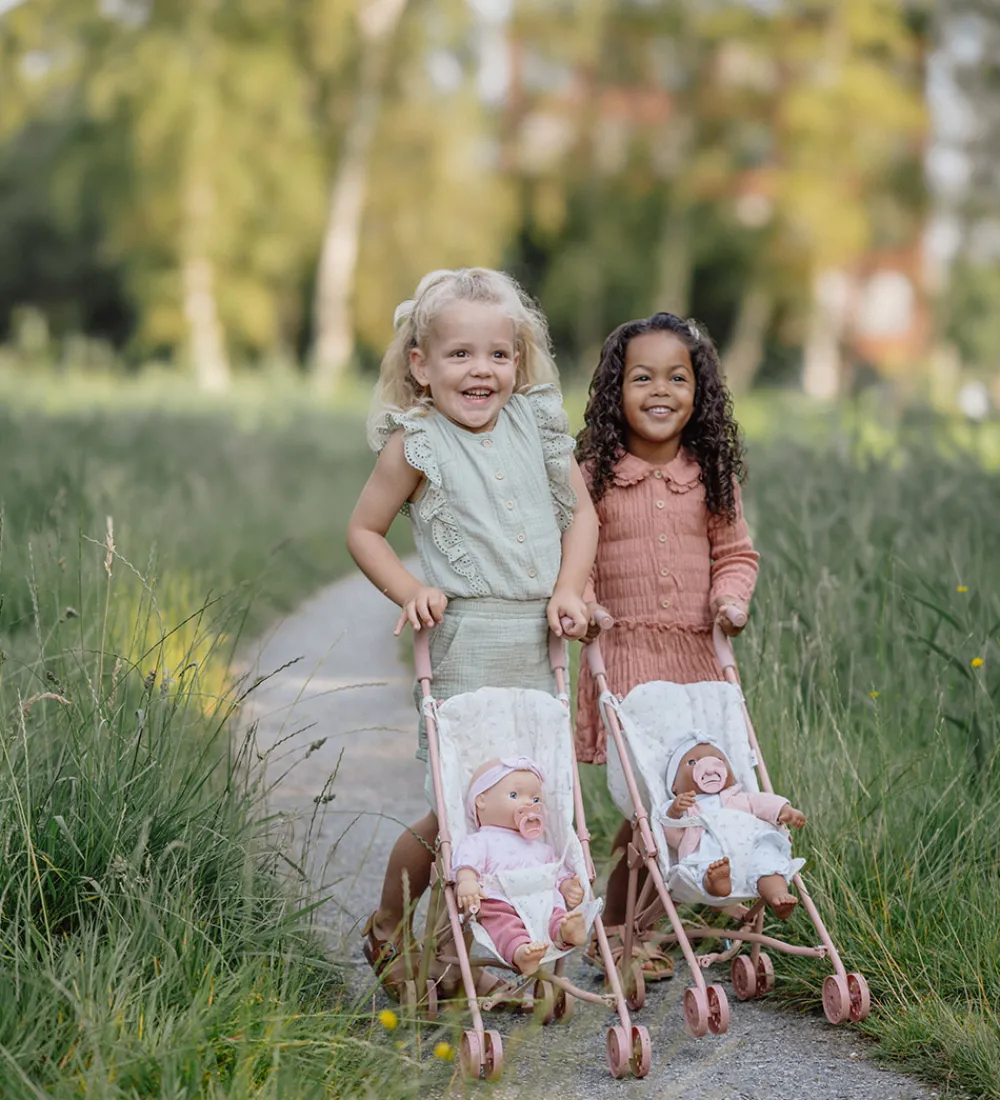 Charmerende Little Dutch dukke iført en kjole og et par bukser med fint blomstermønster samt en rosafarvet cardigan. Little Dutch dukken har en matchende hårbånd med blomsterprint og kommer med en sød flaske og sut.