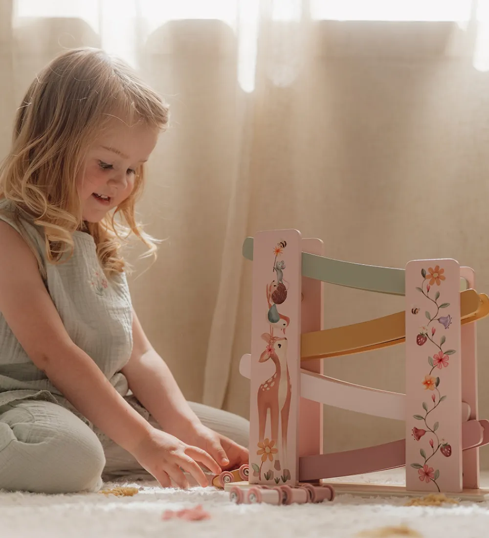 Little Dutch kuglebanen har fire små køretøjer, som kan køre ned af banen. Banen er formet på en smart måde, så kuglerne triller uden problemer og gør det sjovt for de små, at køre dem lige efter hinanden gang på gang.