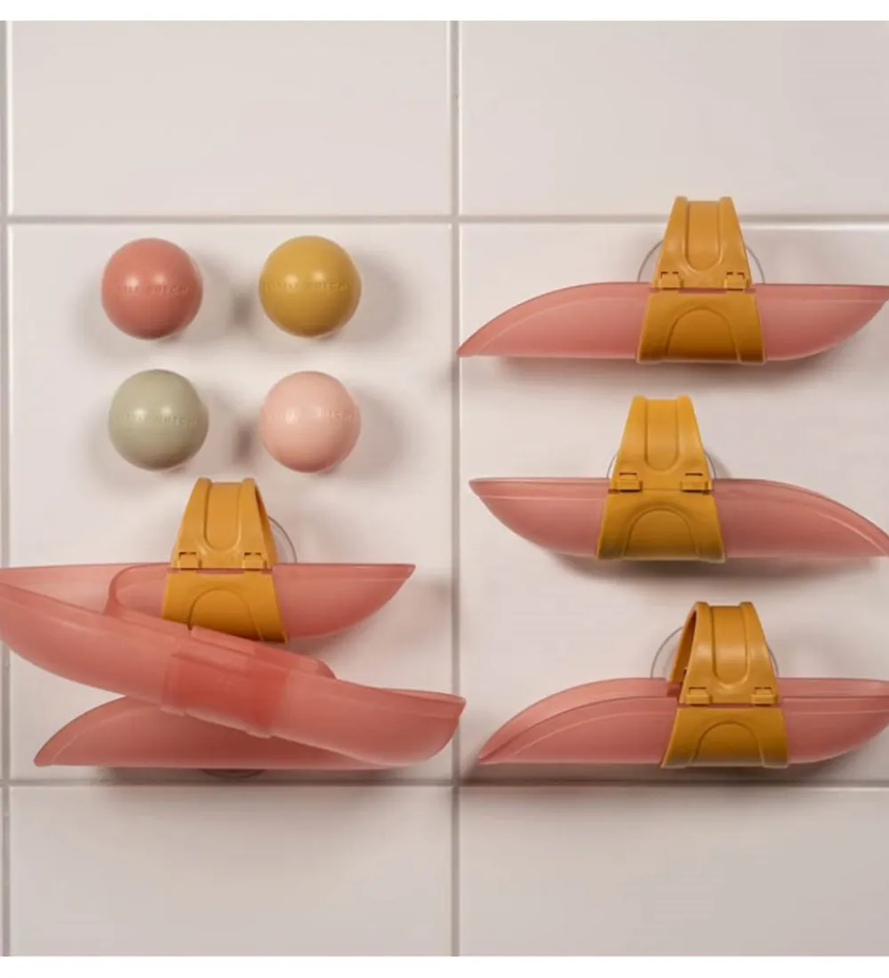 Little Dutch bådene hænges op med sugekopper på badeværelsesfliserne i forskudt af hinanden, så de tilsammen danner en kuglebane, som de små kan lege med, imens de er i bad.