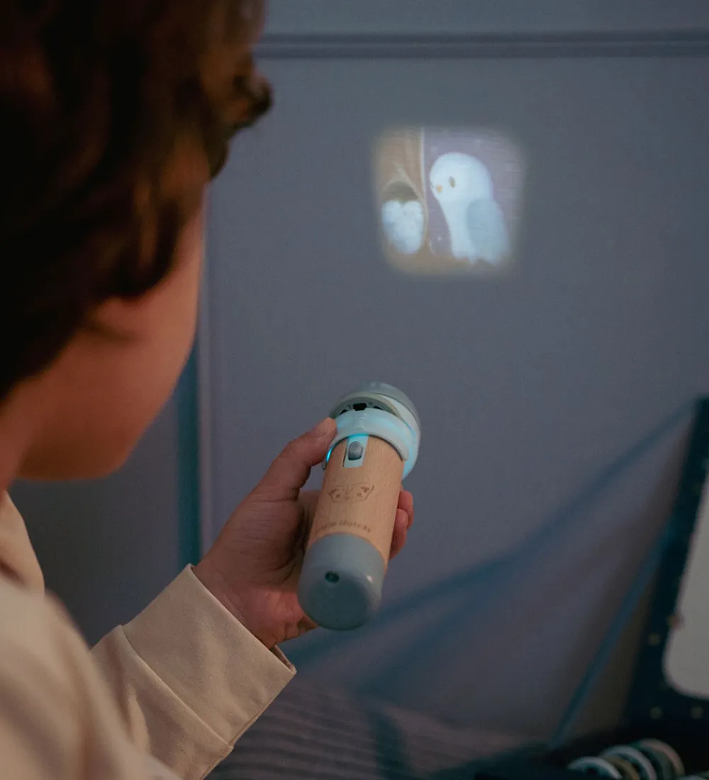 Projektorlommelygten kommer i en æske hvor der er en lille projektortavle, en lommelygte, 12 skiver og en bog. De 12 skiver sættes i lommelygten én ad gangen, og har hver sin historie, som vækkes til live med flotte illustrationer, som projiceres op på væggen eller på den lille tavle. Hver historie suppleres med illustrationer fra bogen.
