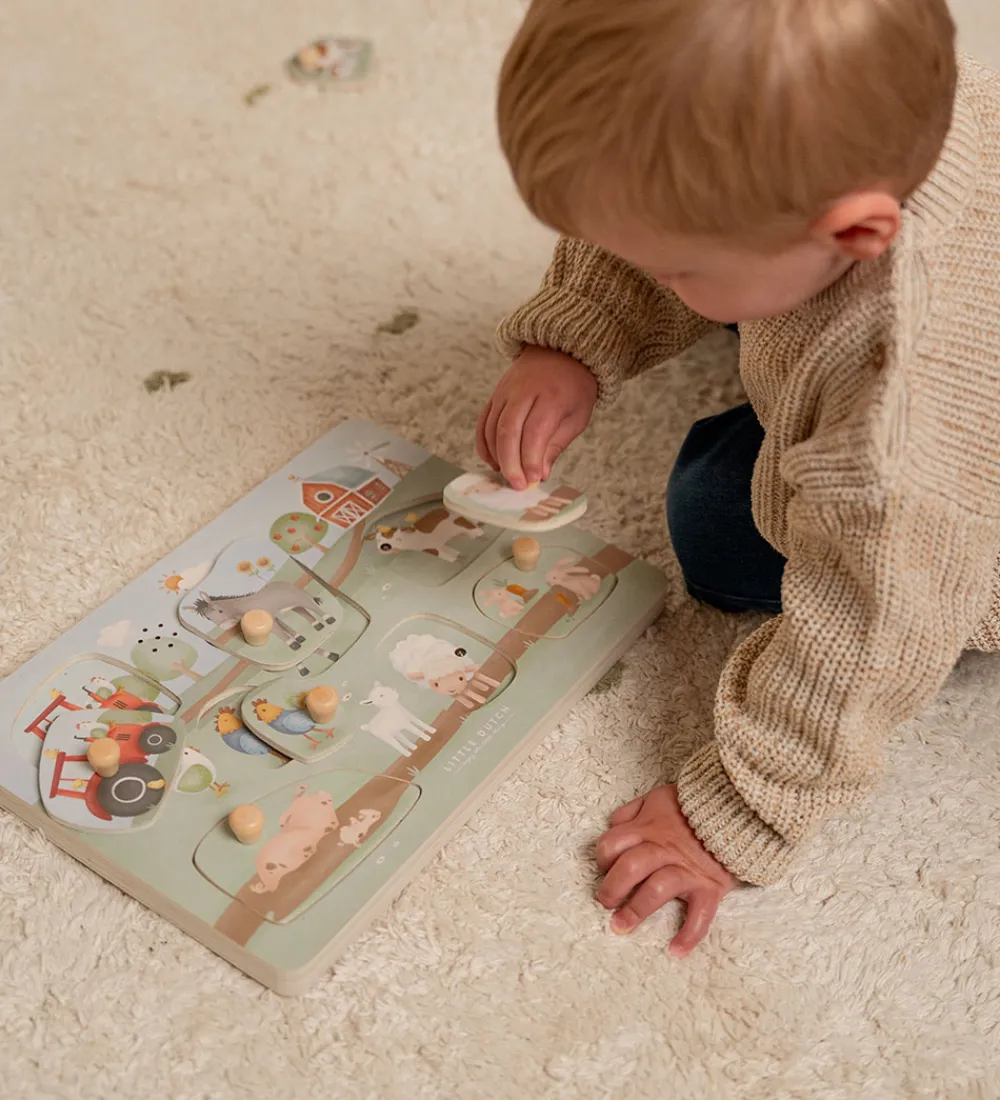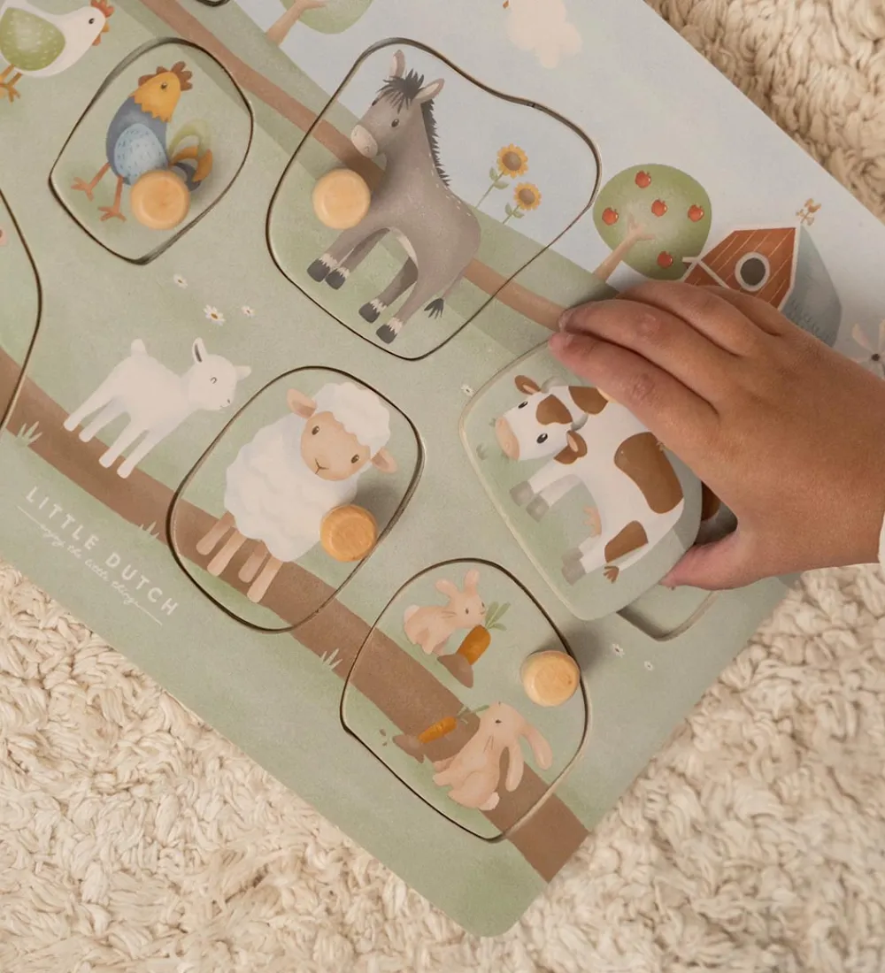 Fint Little Dutch puslespil i træ med motiv af en bondegård med traktor og dyr.