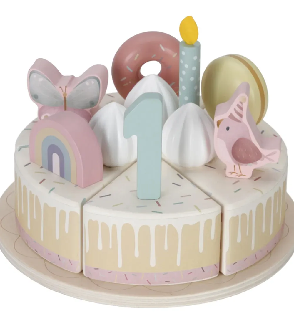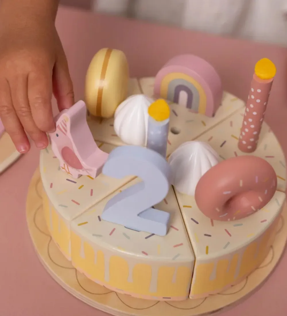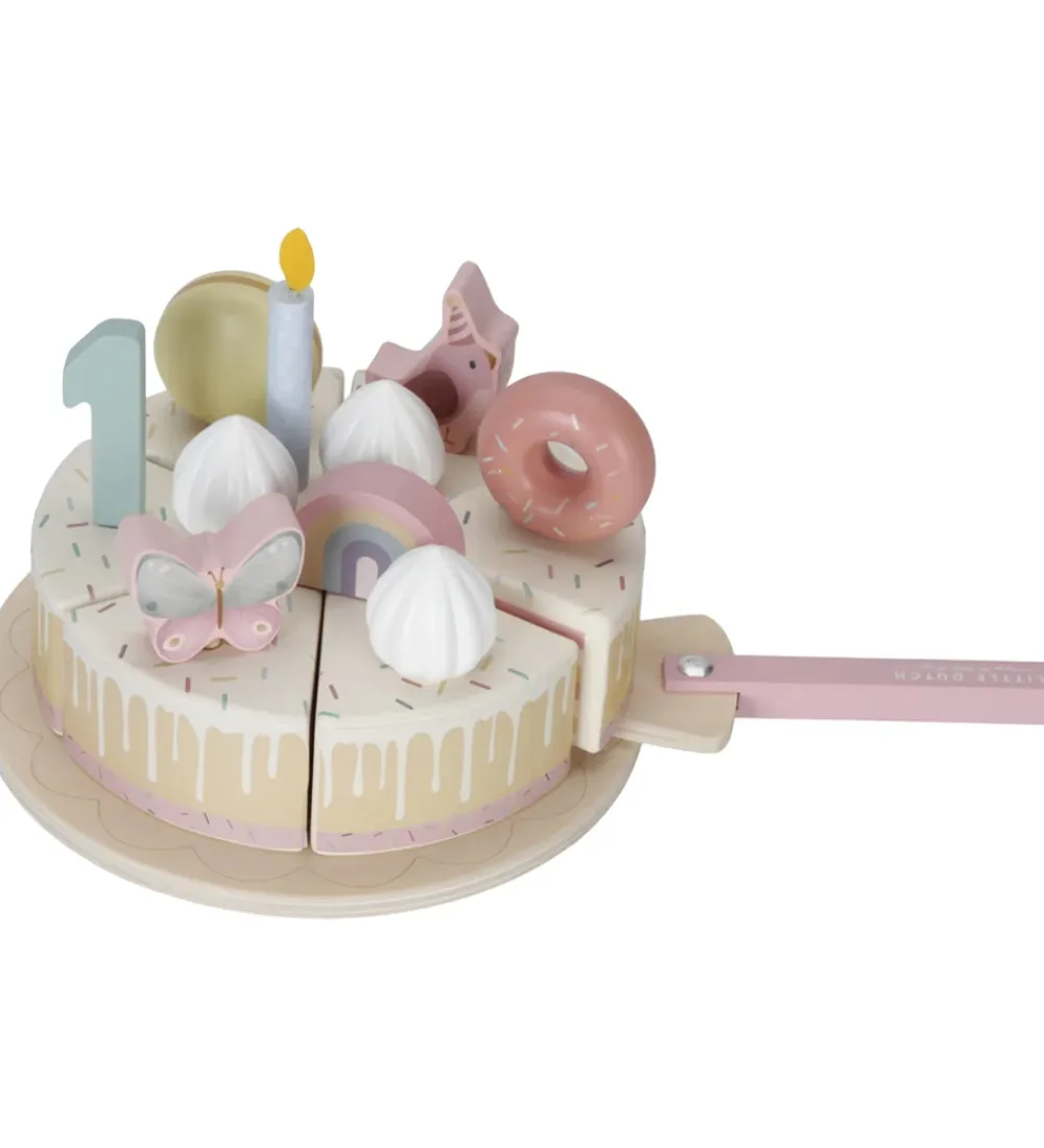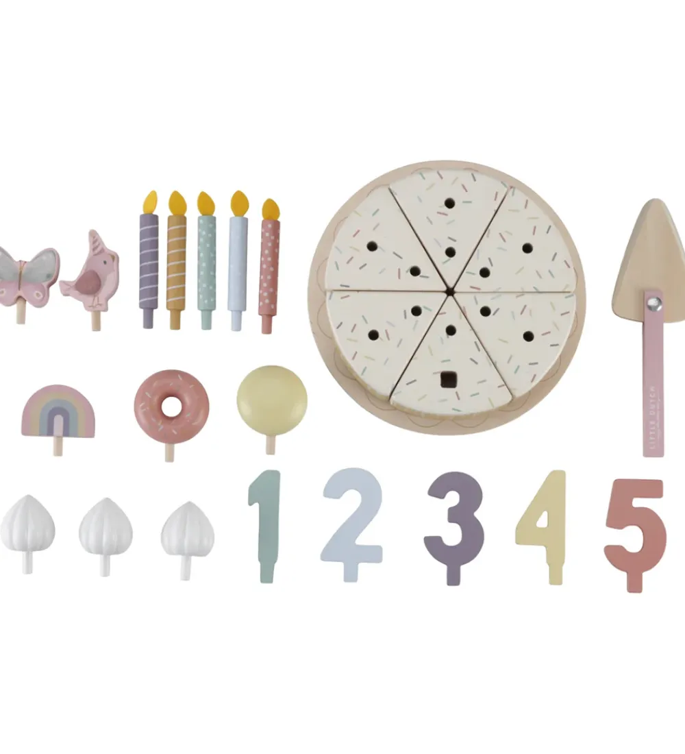 Little Dutch fødselsdagskagen er samlet af 6 dele, og der medfølger 5 lys, pynt til kagen og tallene 1 til 5, som alt sammen kan placeres på toppen af kagen. Der medfølger også et kagefad og en kagespade, så man kan serverere lækker legemad til alle sine venner.