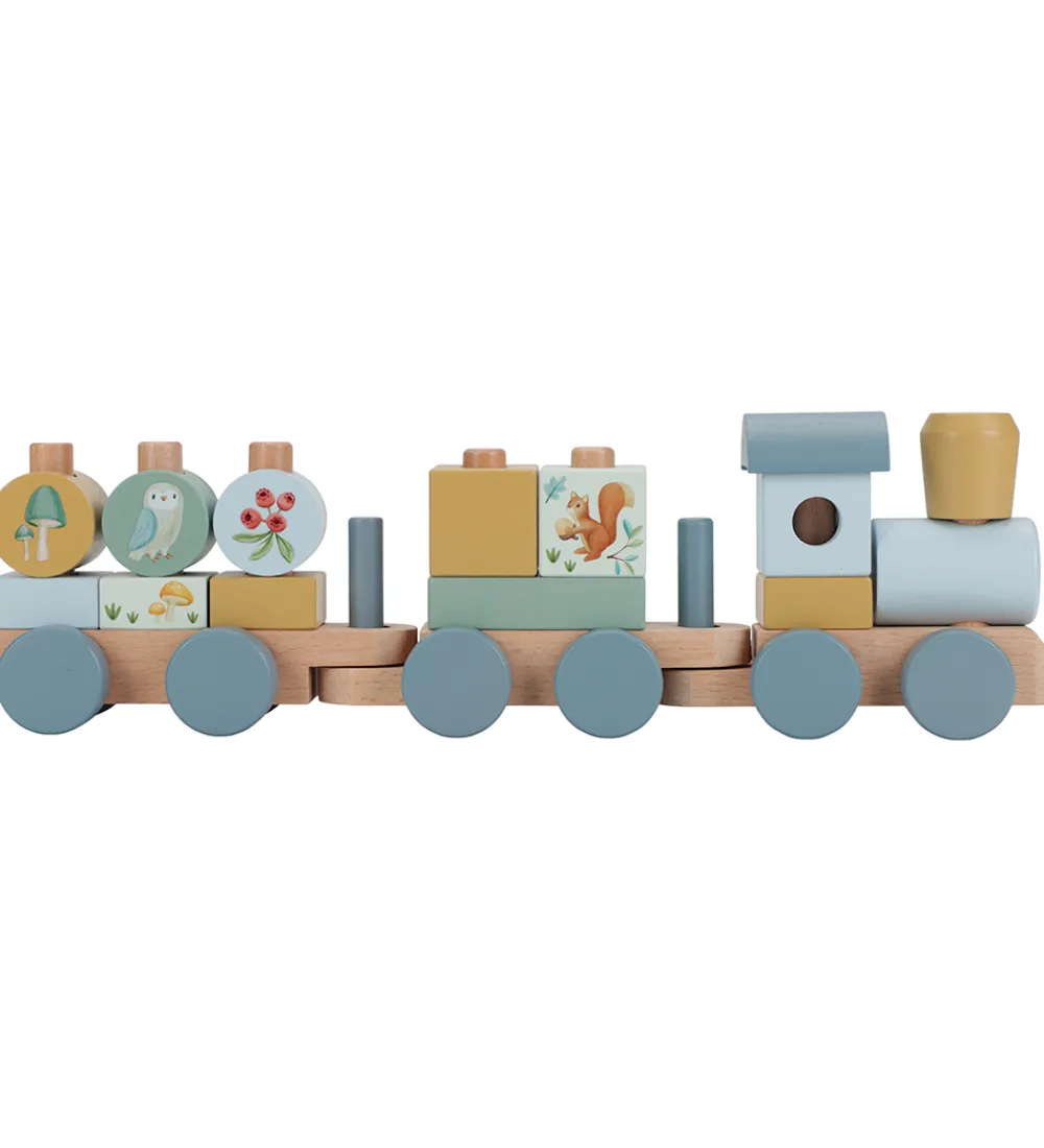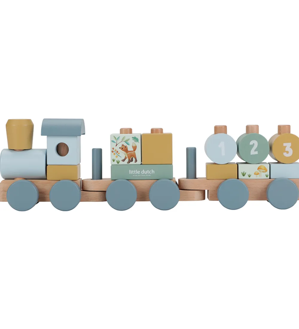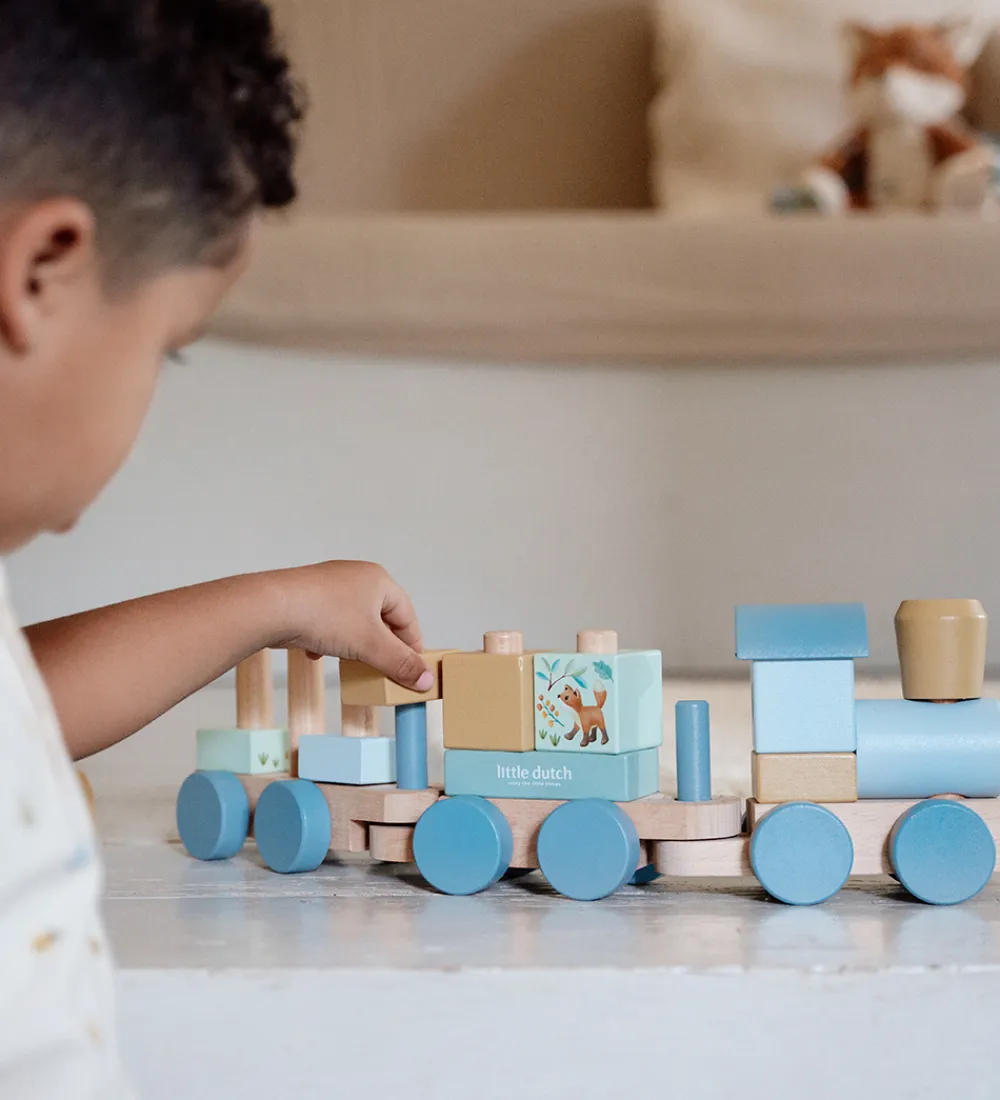 Little Dutch stabletoget har små hjul og en lang snor, så barnet kan trække det efter sig. Klodserne i det hyggelige tema skal stables på toget og køres med på tur.