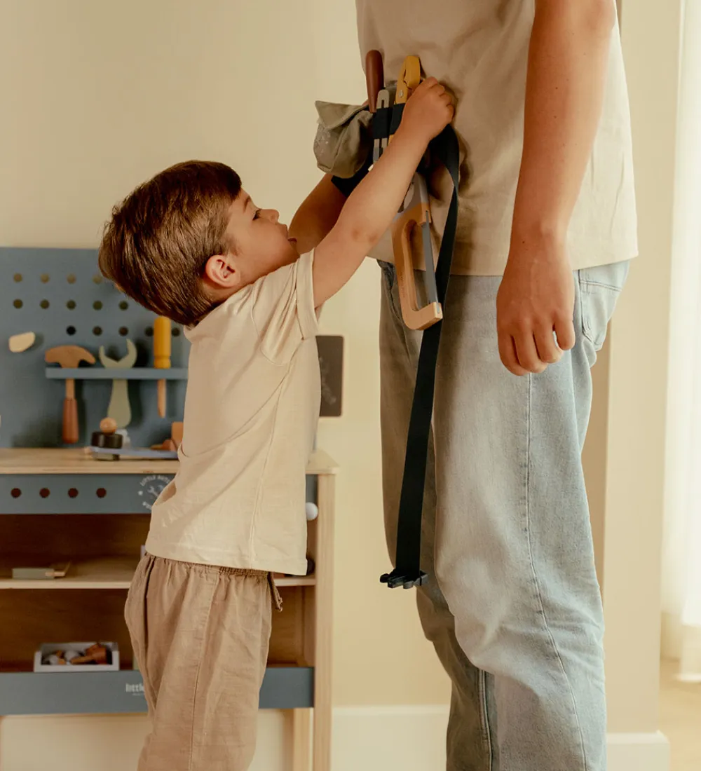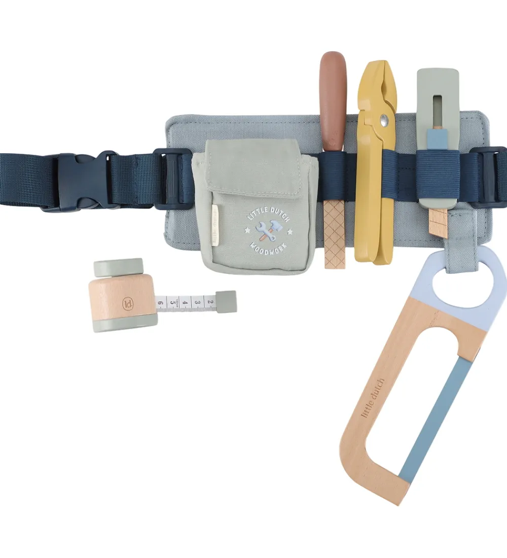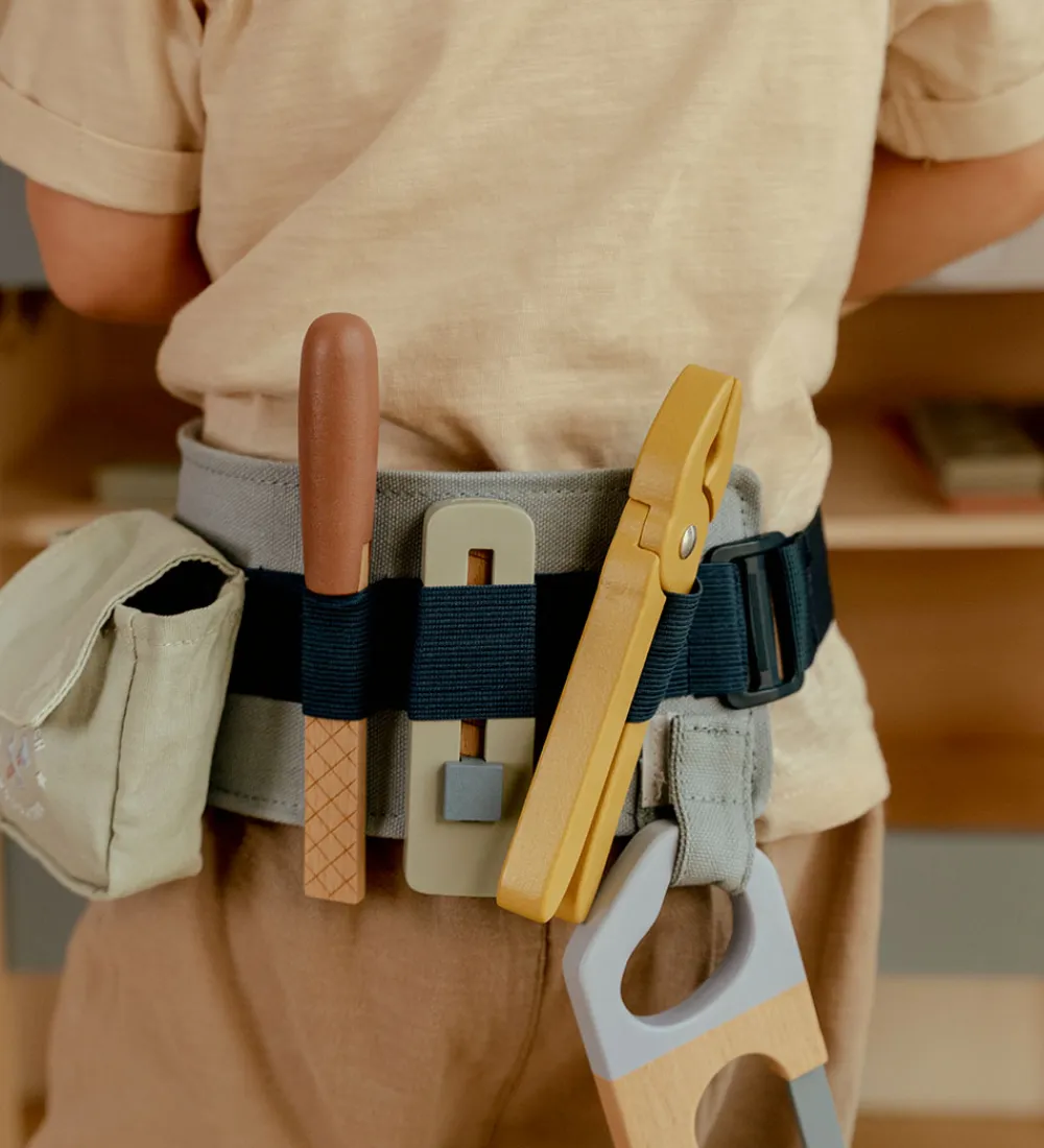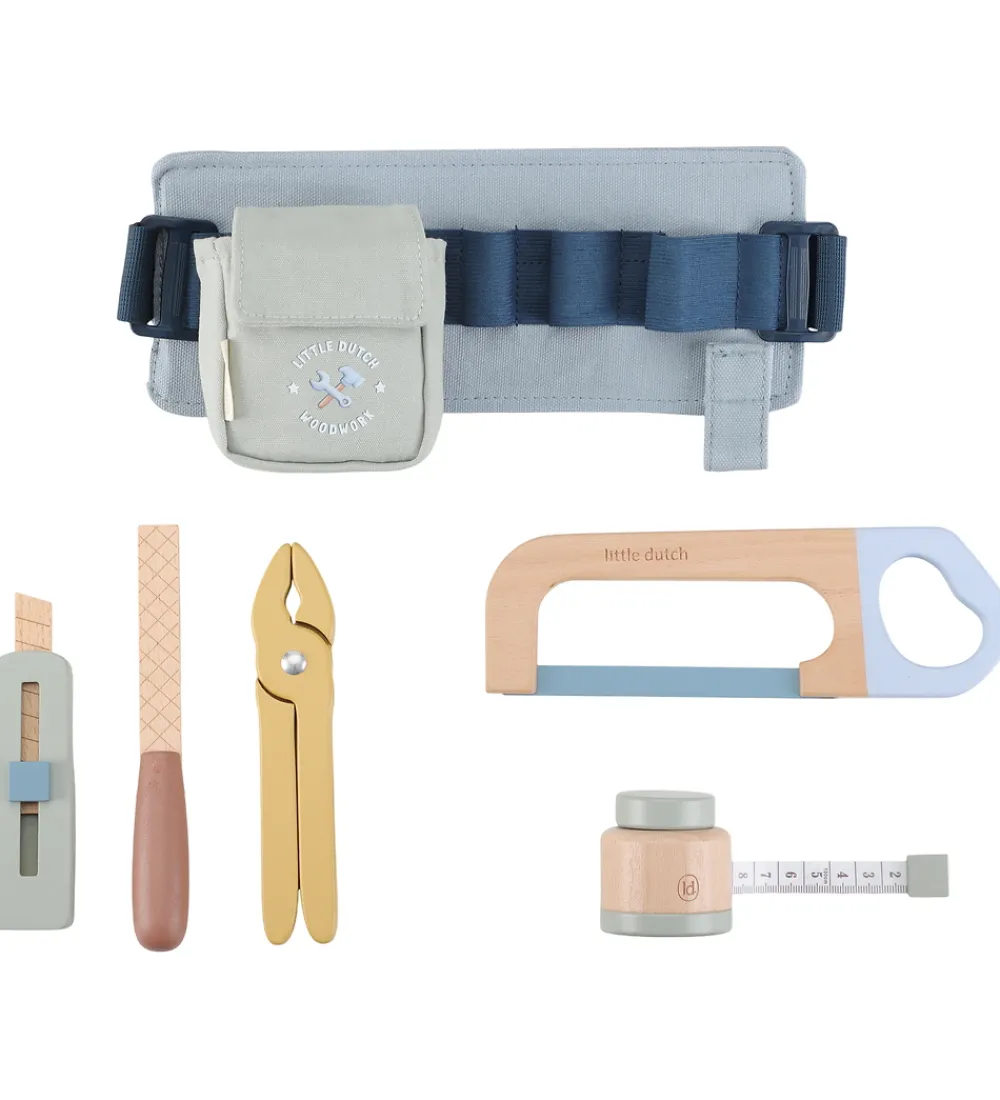 Sjovt Little Dutch værktøjssæt med justerbart bælte i støvet grøn. Værktøjssættet indeholder alt en lille håndværker har brug for, som f.eks. en sav og skruetrækker. Skønt sæt til kreative opgaver.