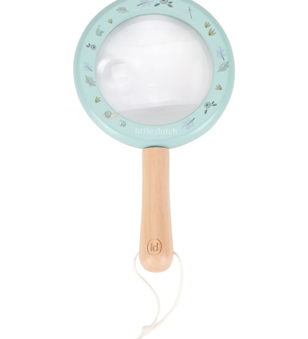 Spændende Little Dutch forstørrelsesglas i turkis træ med print af små blade og insekter. Forstørrelsesglasset har et træhåndtag, så det er let at anvende. Forstørrelsesglasset opfordrer til nysgerrighed og udforskning, mens børnene oplever naturen på en sjov måde.