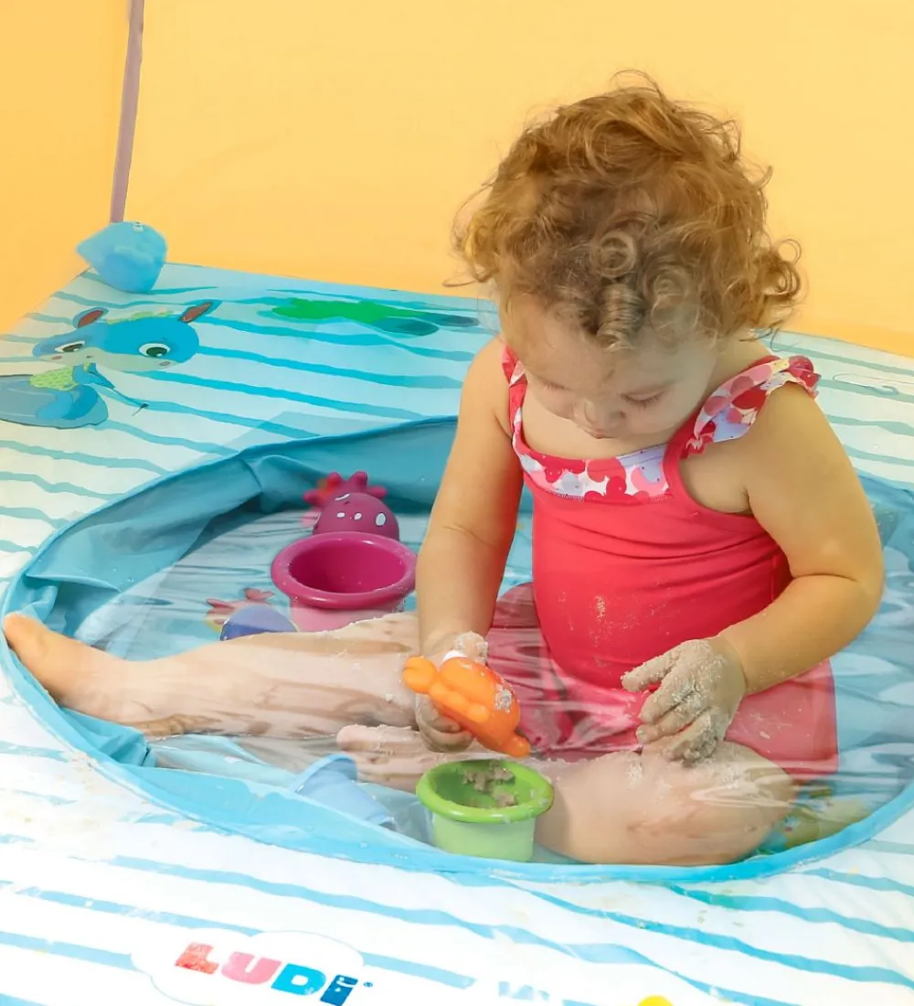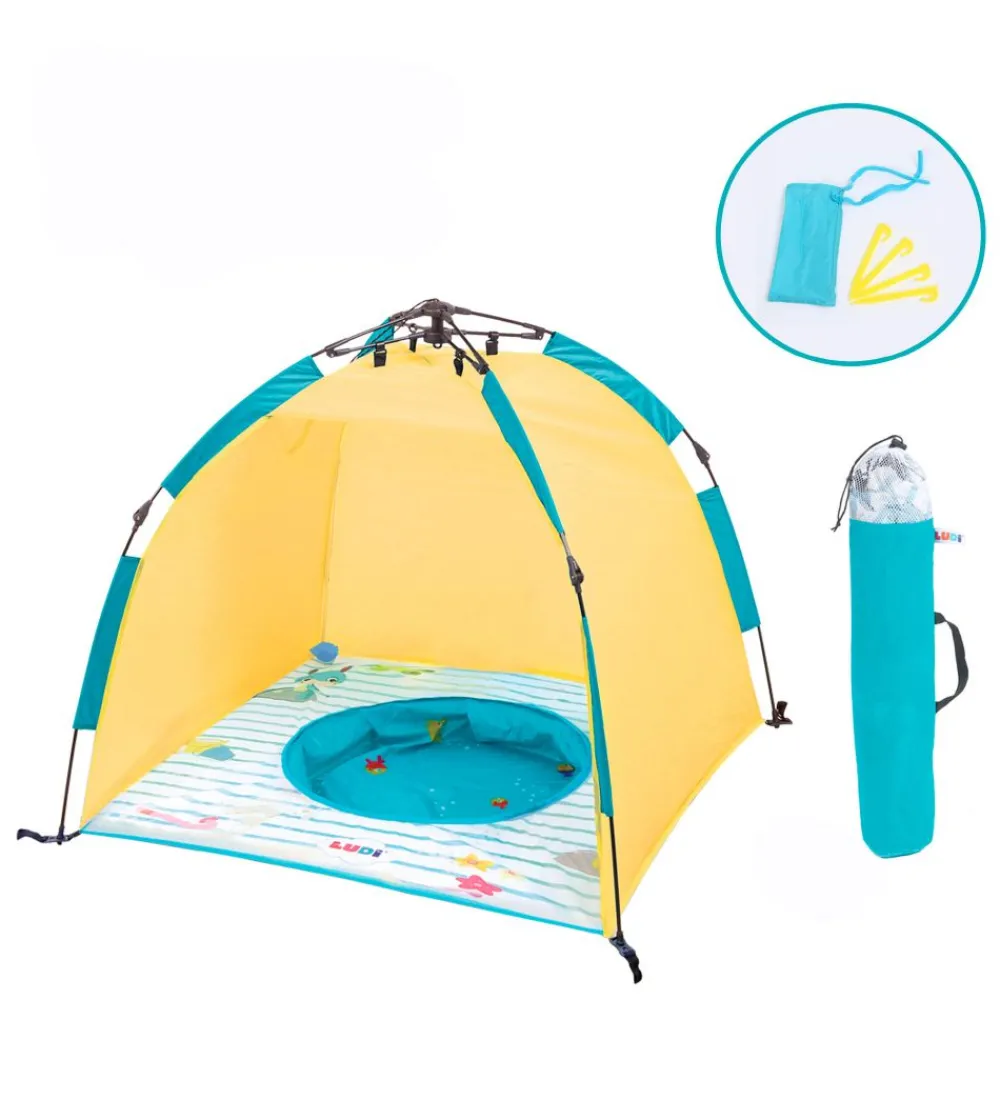 Ludi skyggeteltet er let og hurtigt at folde ud og sammen igen, med det smarte system tager det kun op til ét minut. Teltet fastgøres med fire medfølgende pløkker i hjørnerne, så det sidder godt fast. Bassinet kan let fyldes med vand og teltet giver en god beskyttelse fra solen til de små.