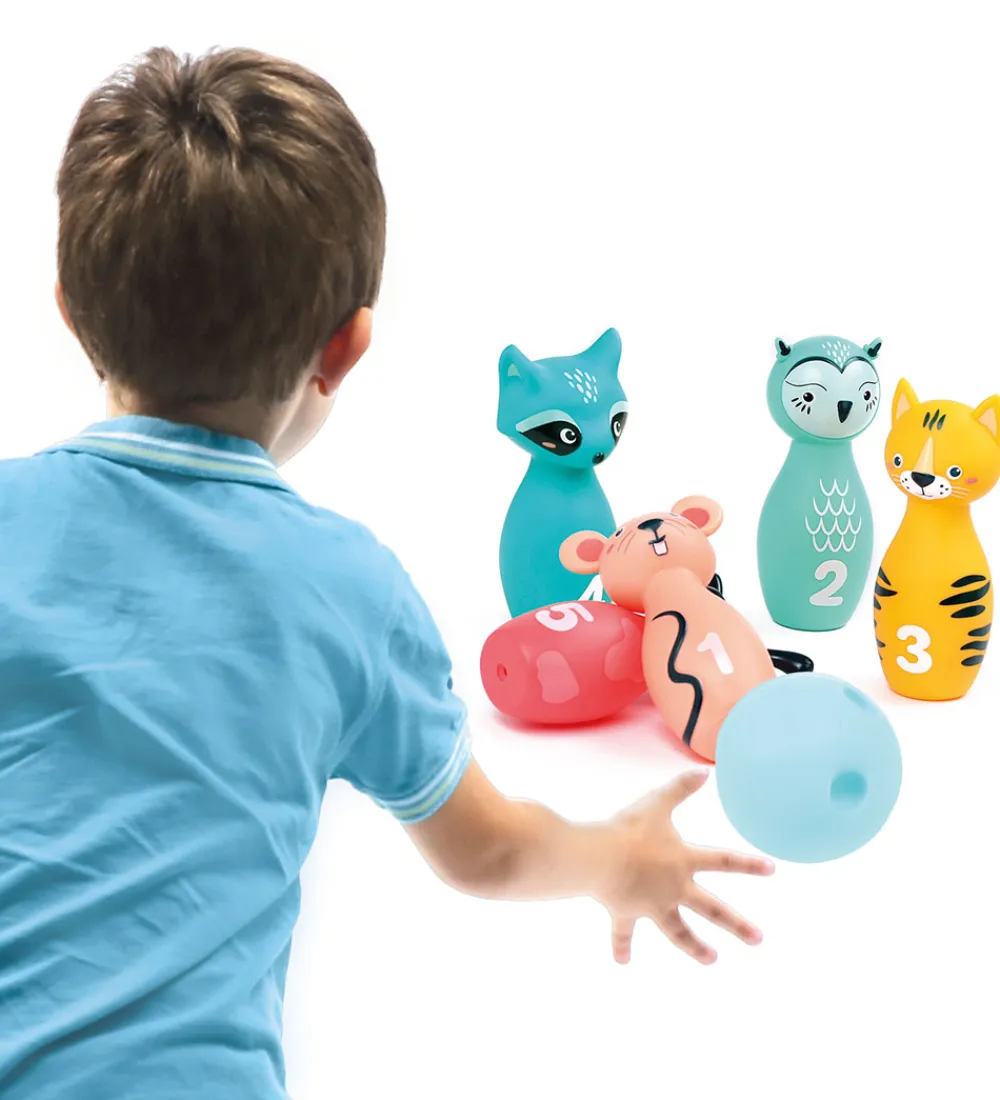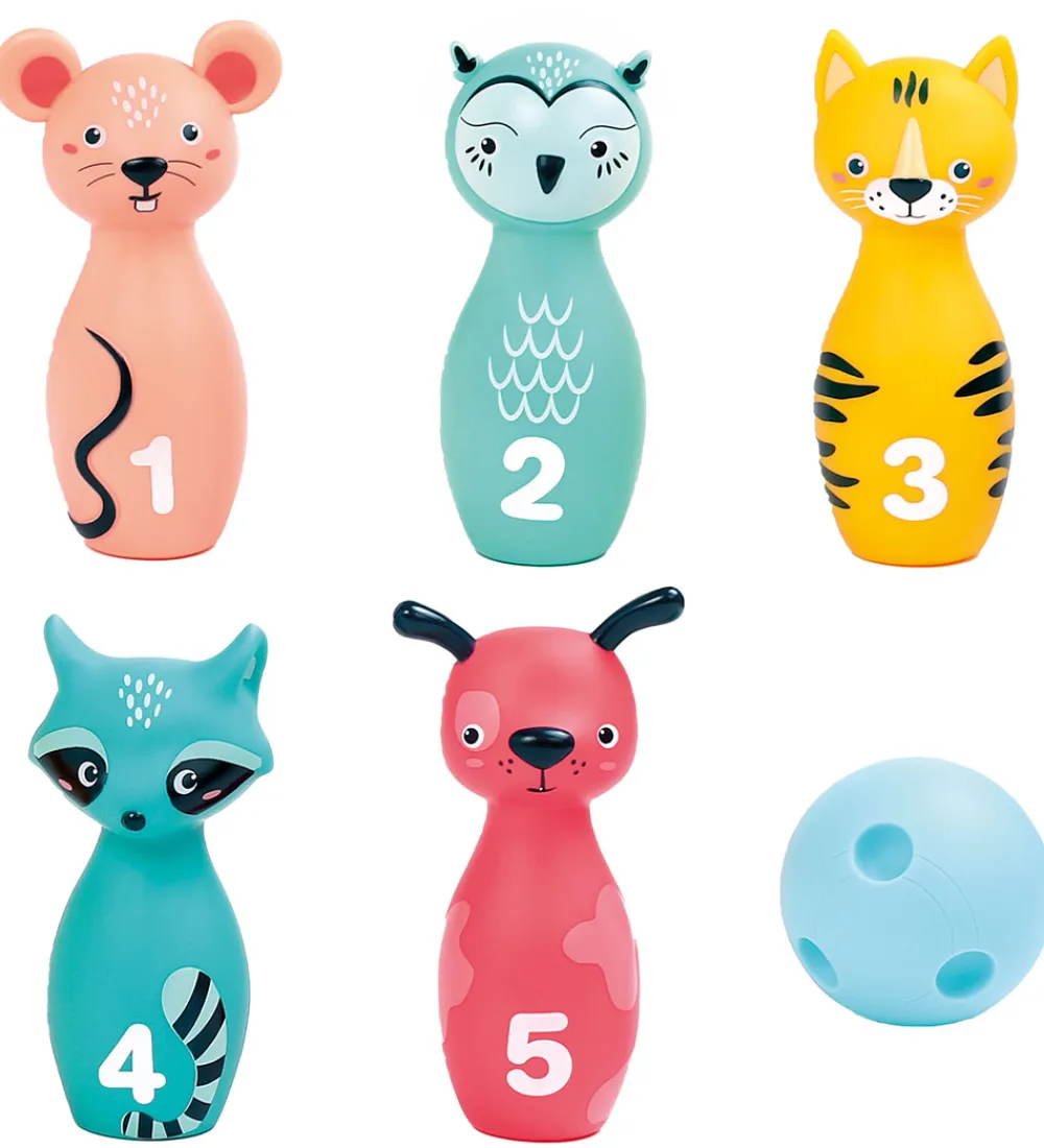 Underholdende Ludi bowlingsæt bestående af fem kegler med dyremotiver samt en mintblå bowlingkugle.