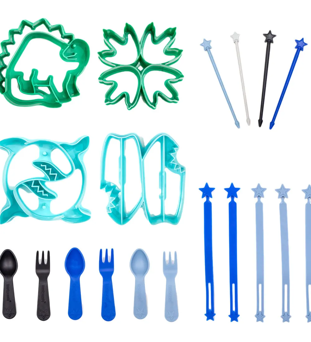 Sjovt Lunch Punch madpakketilbehør i et sæt med et dino/haj-tema i blå, grønne, sorte og grå farver. Sættet indeholder: