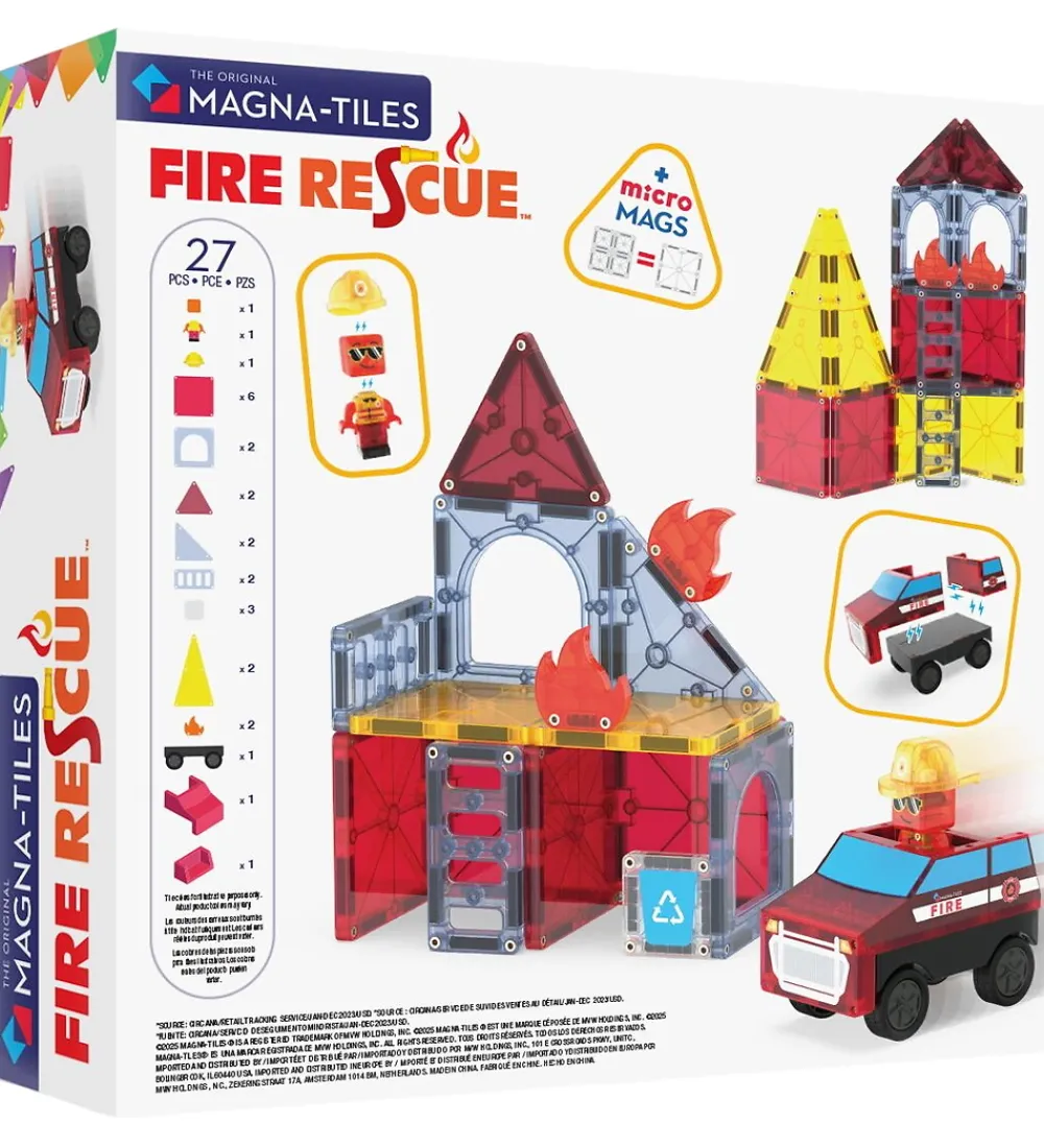 Sejt Magna-Tiles magnetsæt bestående af 27 MicroMAGS og Magna-Tiles i forskellige former og farver, som tilsammen kan danne en brandstation med dertilhørende brandmand og brandbil.