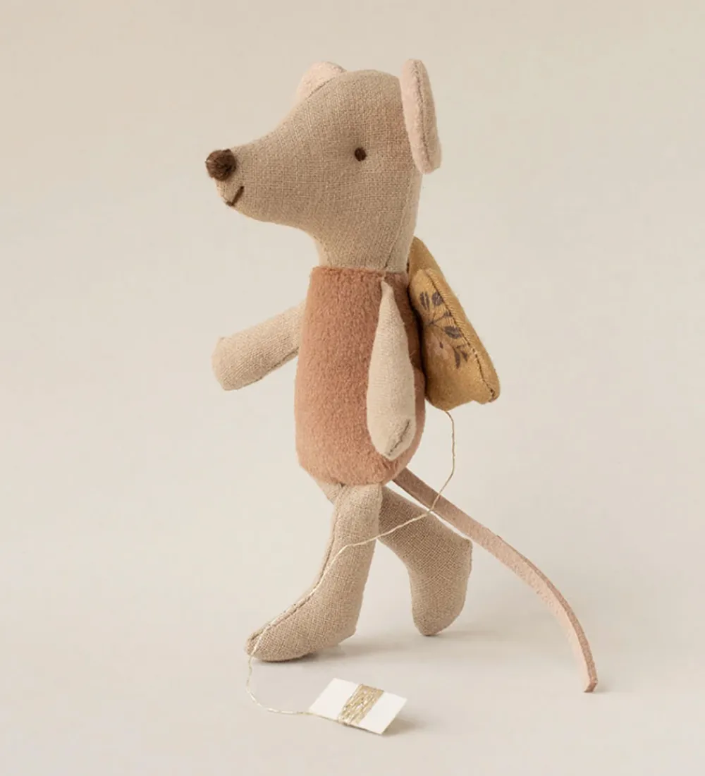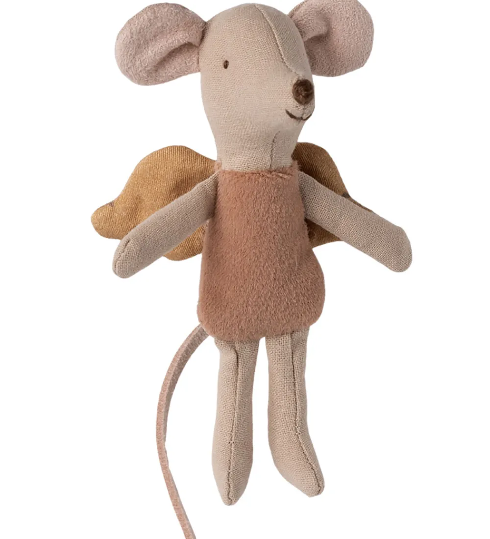 Flot Maileg bamse formet som en beige fe-mus med en pudderrosa velourkrop og med blomstrede vinger.